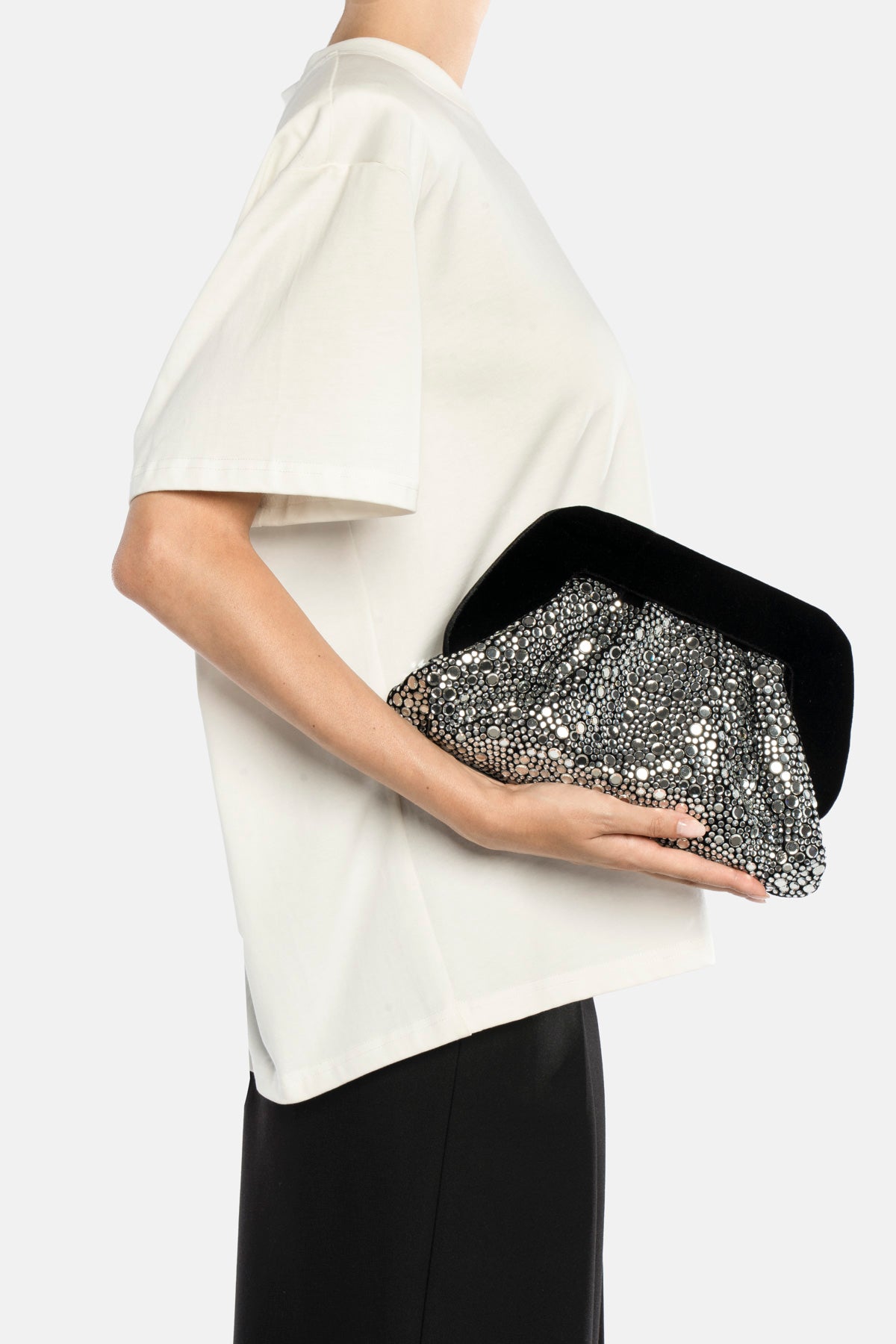 Brillante pochette con manico in velluto e pattern di specchi. Tracolla in metallo removibile.