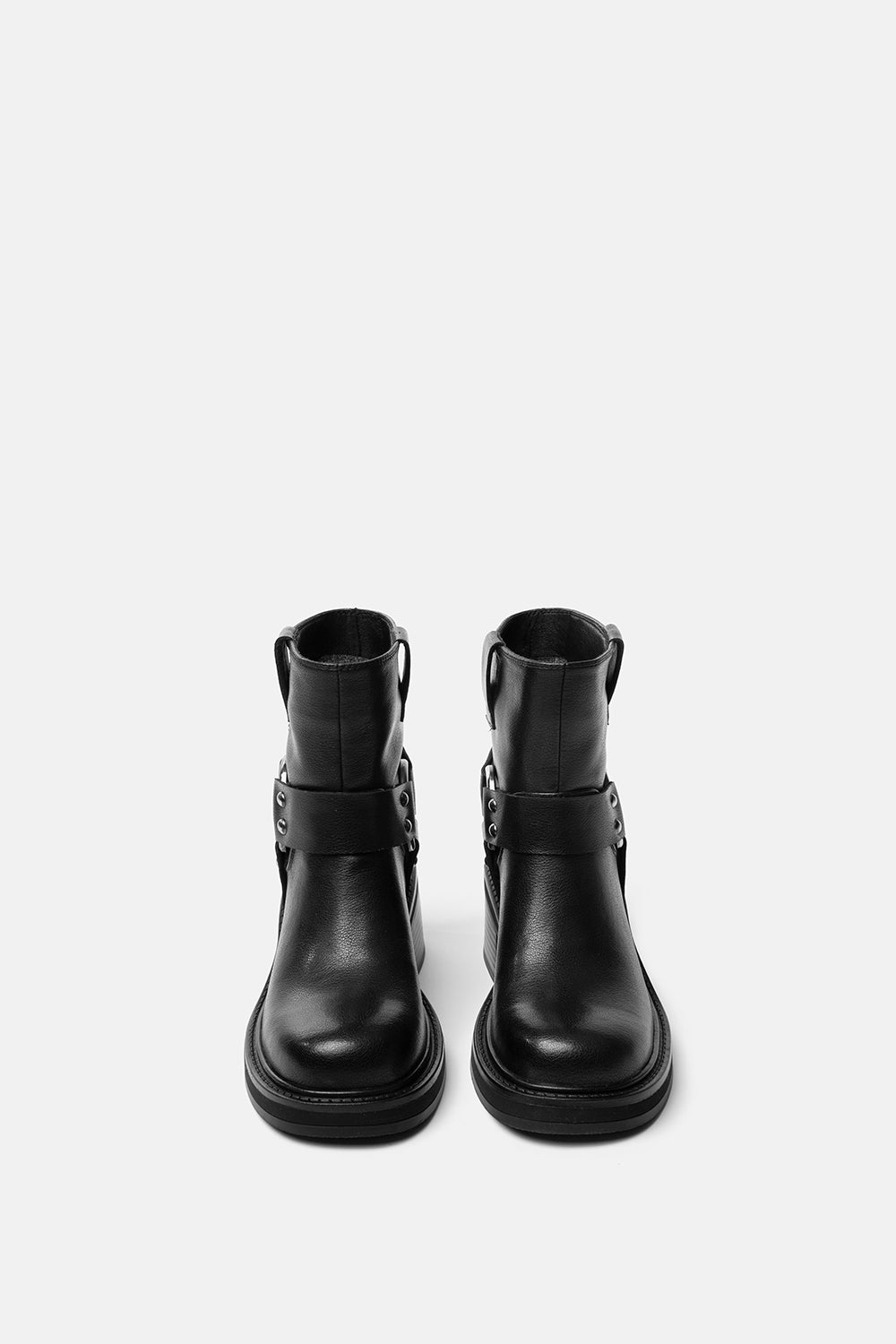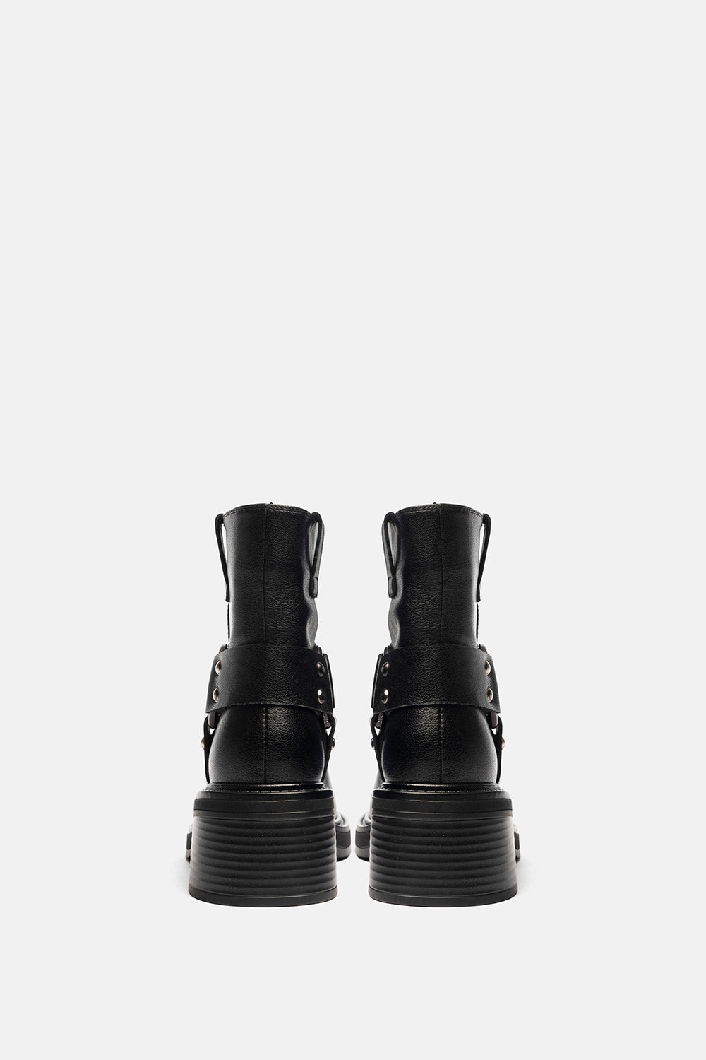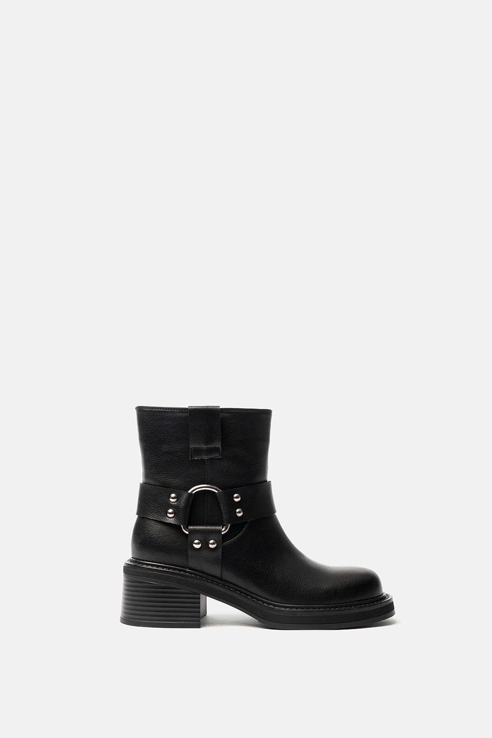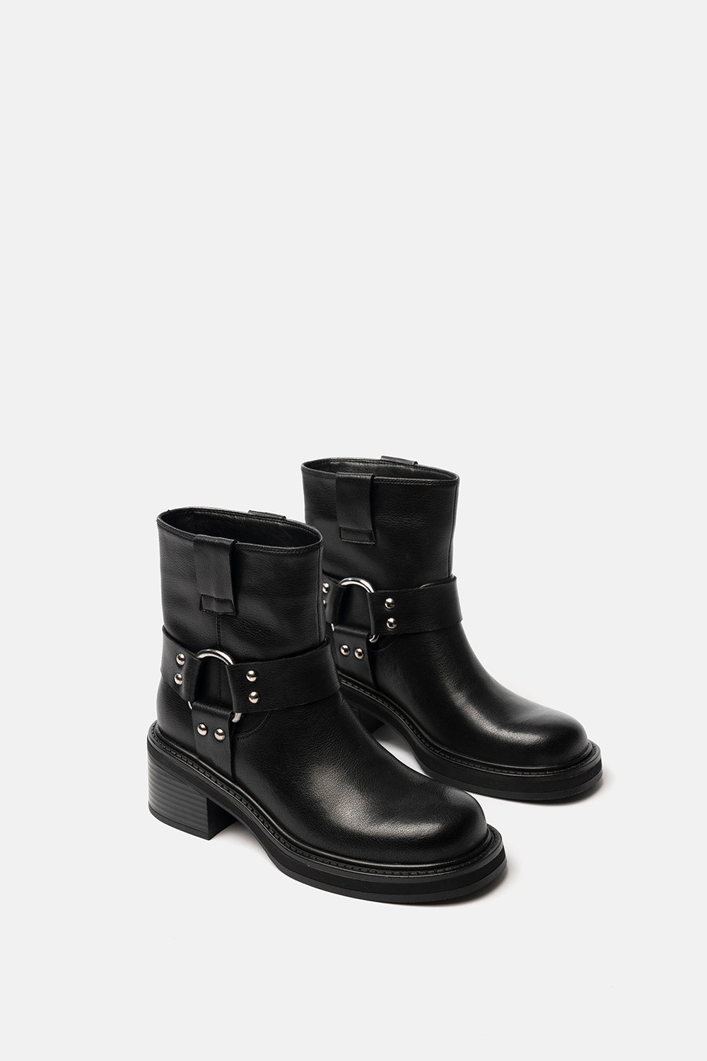 Anfibio basso nero, decoro alla caviglia con cinturini, anello in metallo e borchie.