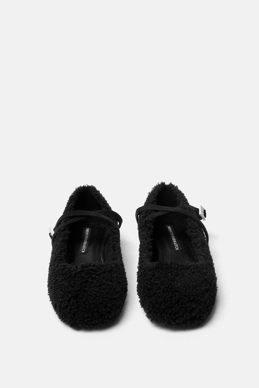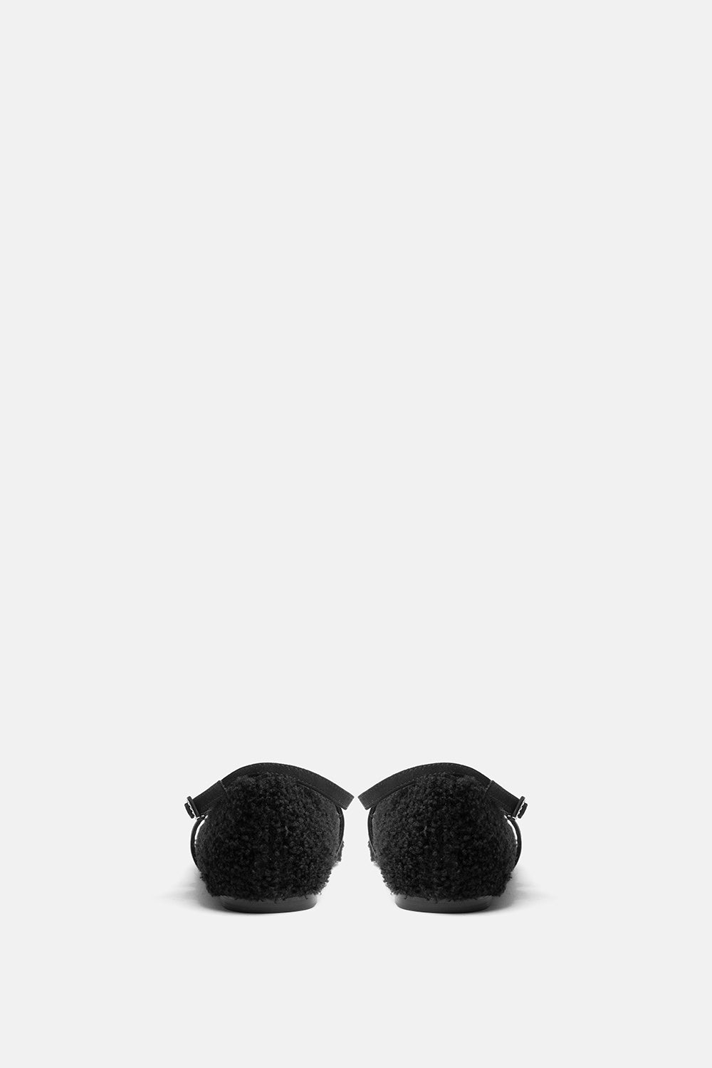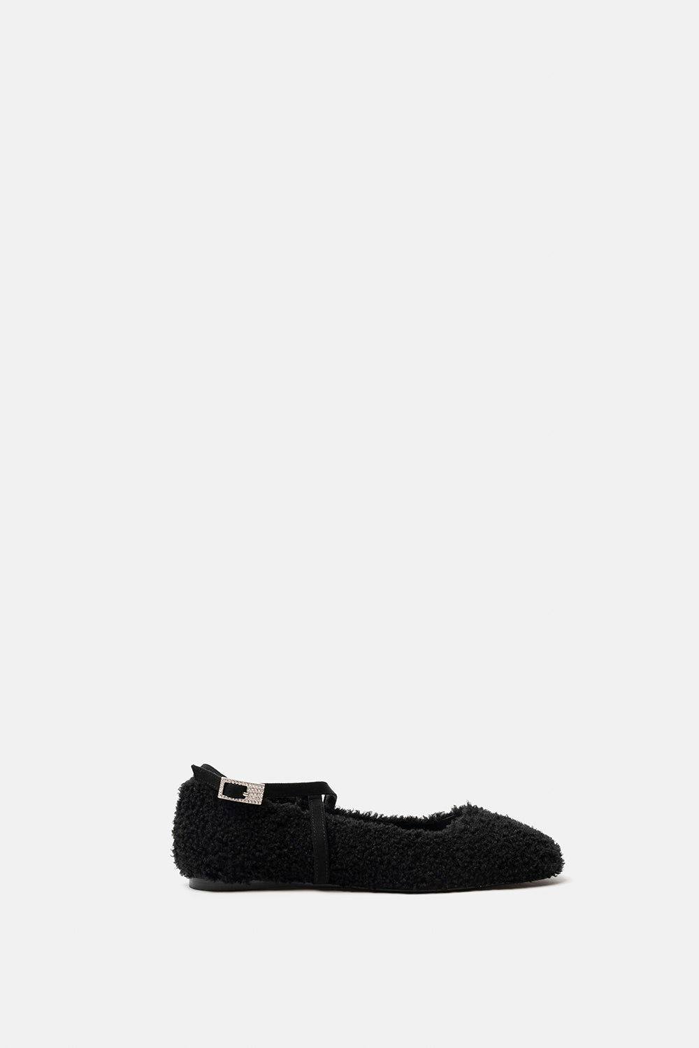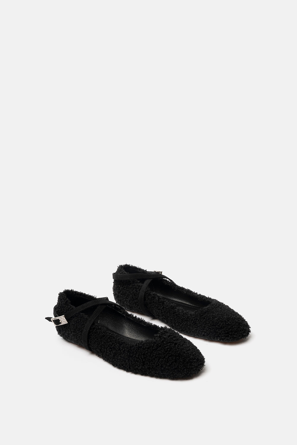 Ballerina effetto montone nero, con dettaglio cinturini a incrocio in camoscio e fibbia gioiello.