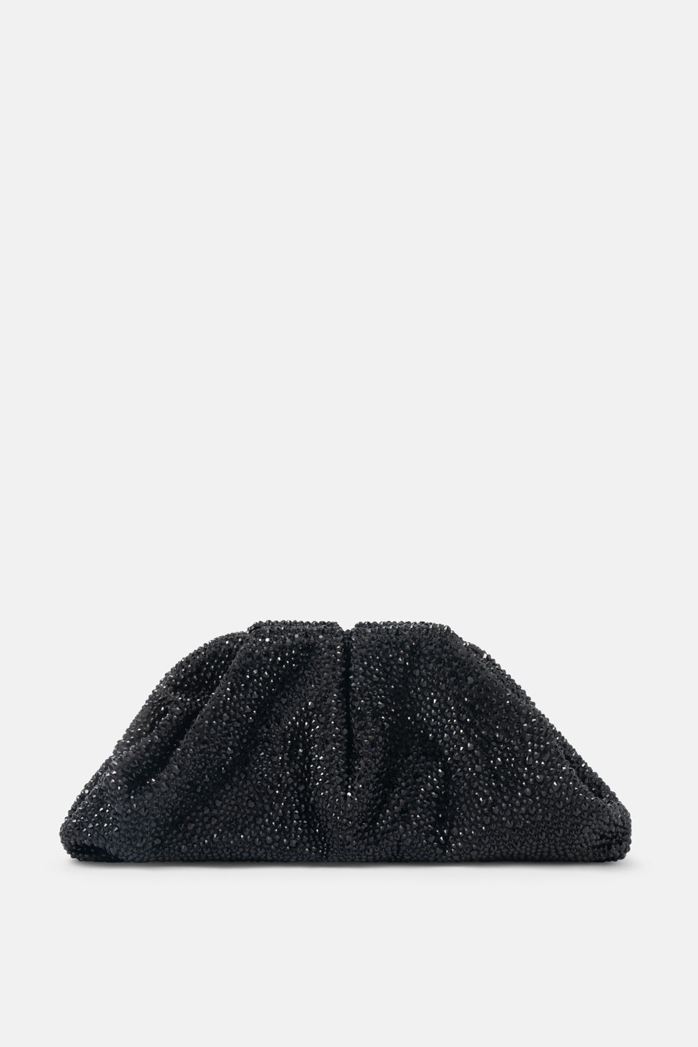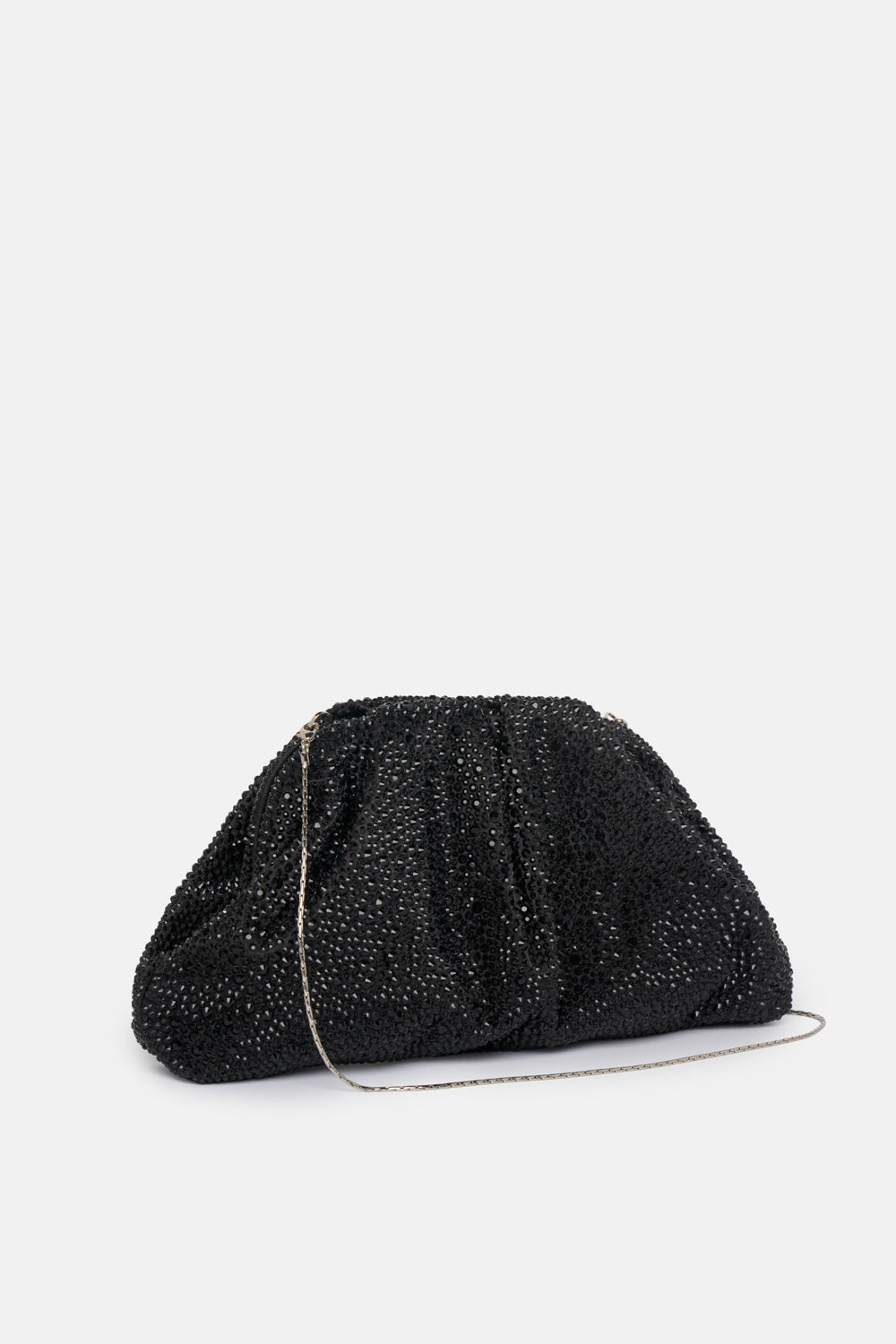 Pouch bag Cambridge glamour in base satin nera impreziosita con strass, indossabile a mano o con tracolla. Chiusura automatica e tracolla removibile.