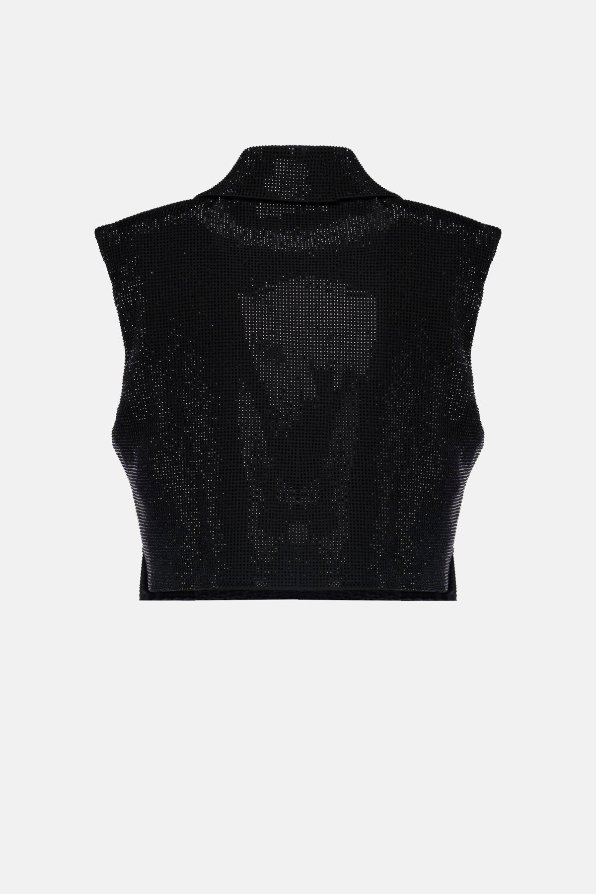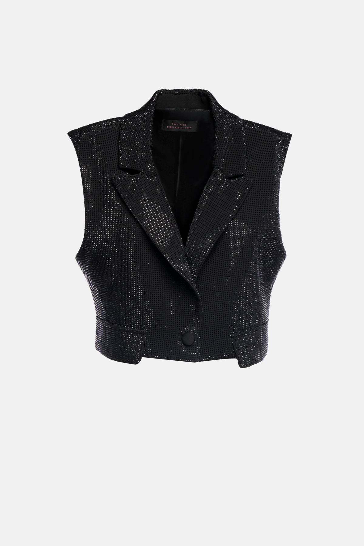 Black Edasic crop vest with peak lapel in technical fabric fully covered with rhinestones and satin lining.