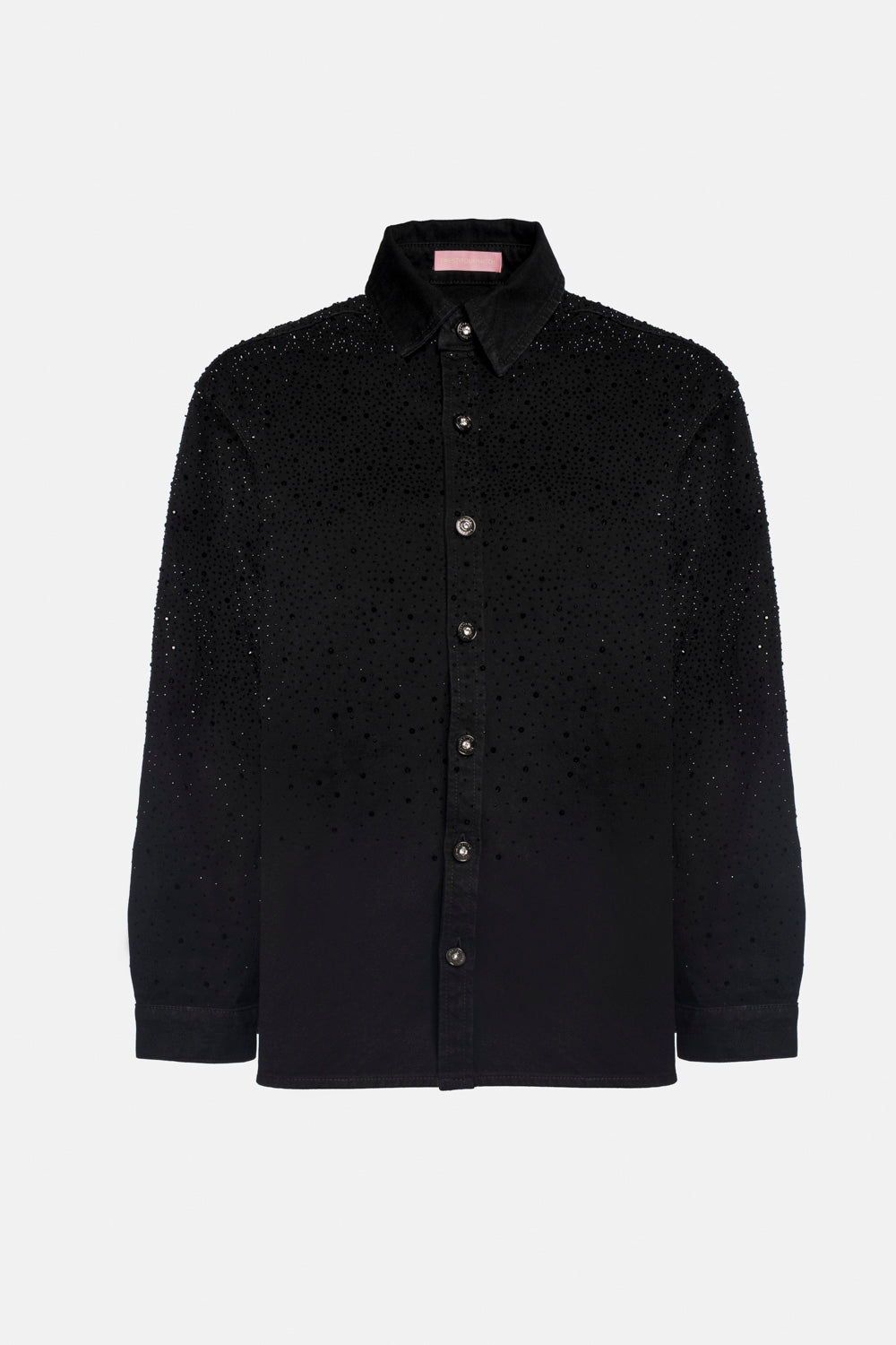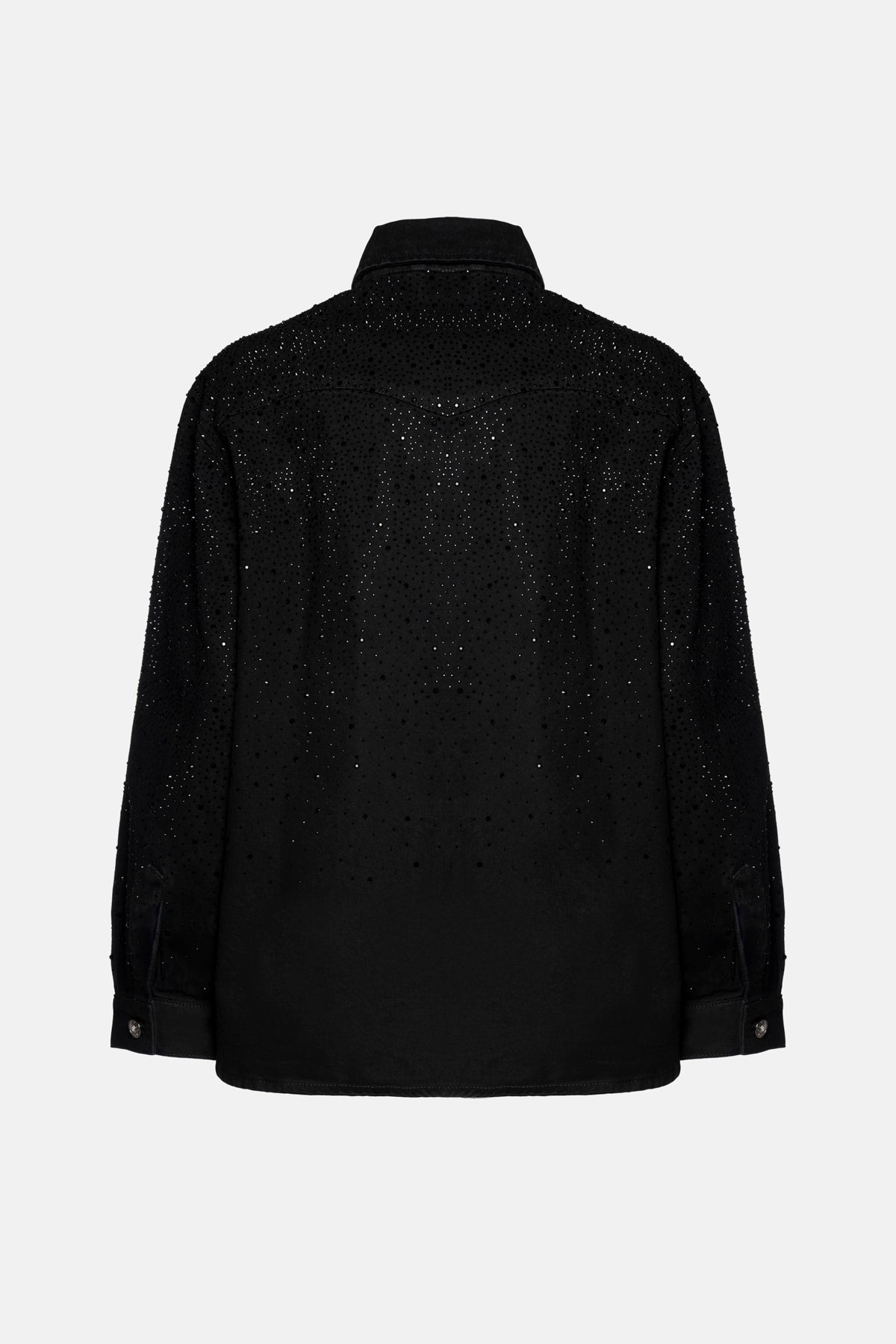 Anser shirt over in black jeans covered with rhinestones, open at the front with buttons and rhinestones.