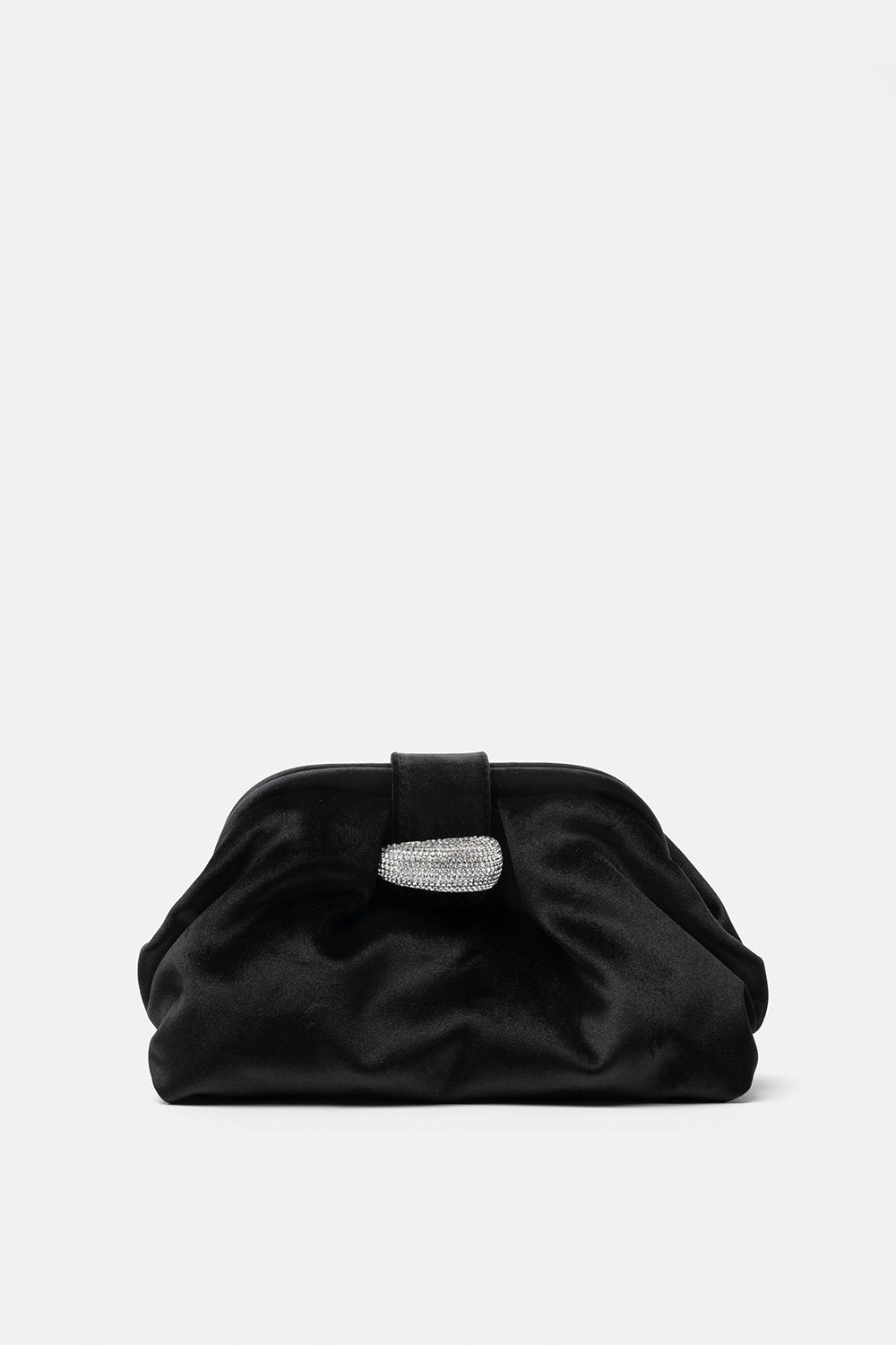 Soft Aludra clutch in black velvet, with flap and jewel buckle. Magnetic closure, equipped with internal shoulder strap.