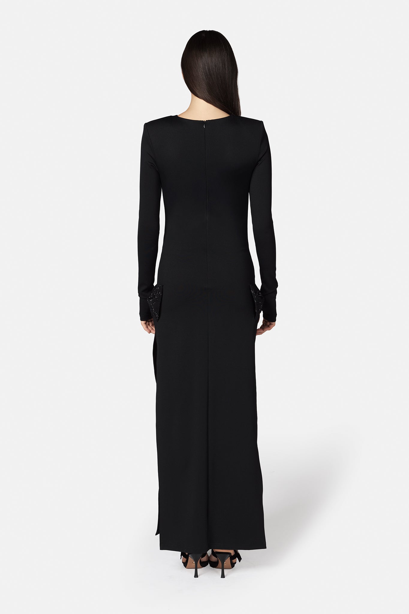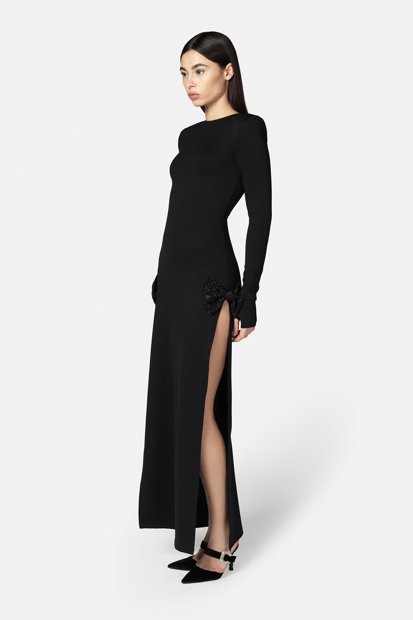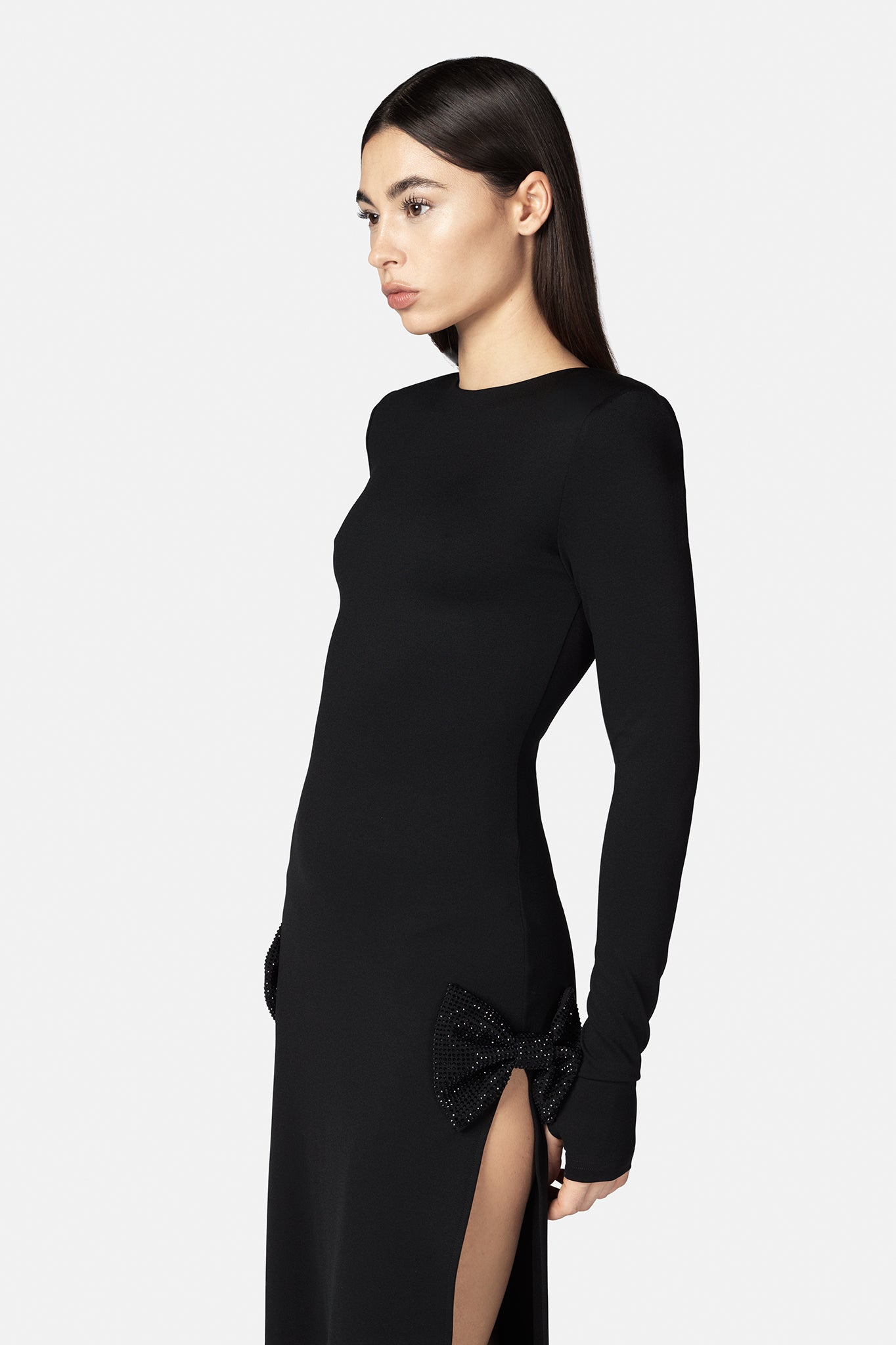 Abito lungo Alchiba nero con spacchi laterali e fiocco tempestato di strass, in tessuto tecnico. Spalline alte e zip centro dietro.