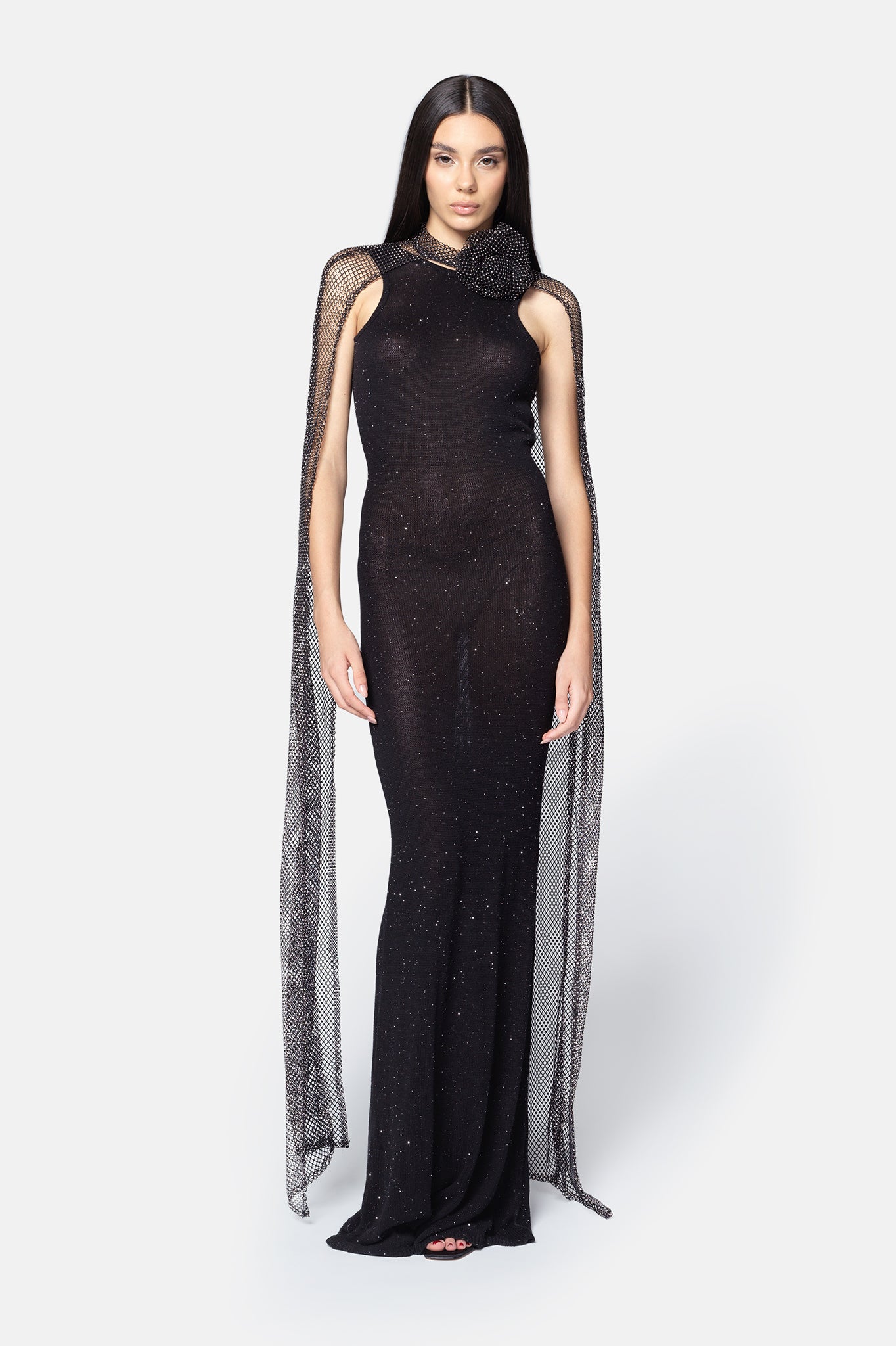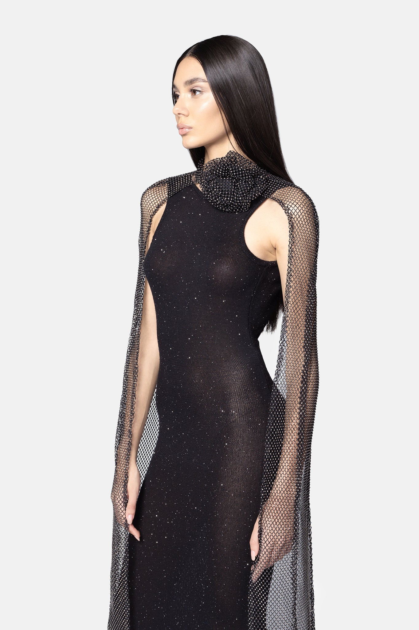 Black Mantella Scotland in rhinestone mesh with buttons on the back collar. Enriched with a flower applique on the front.