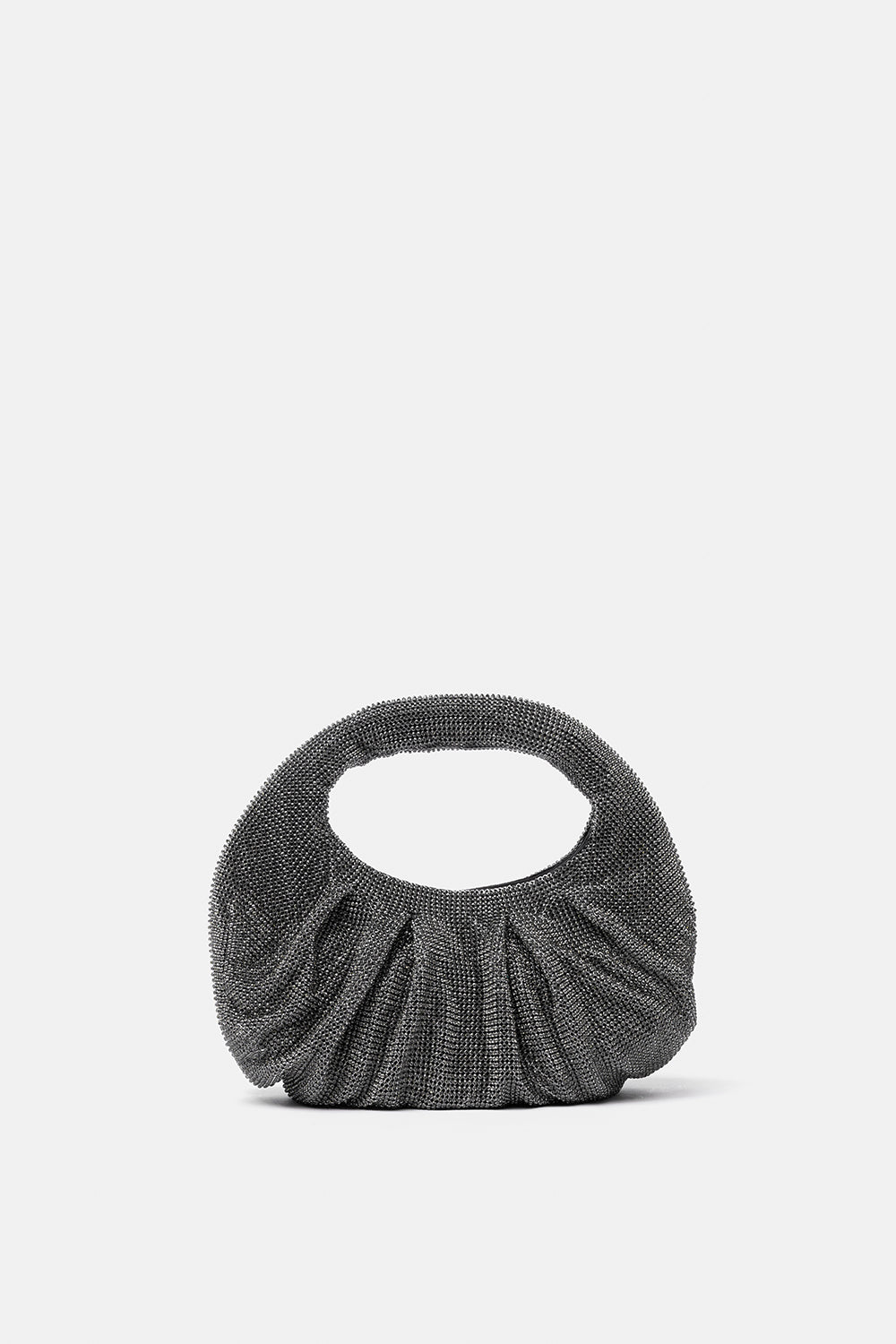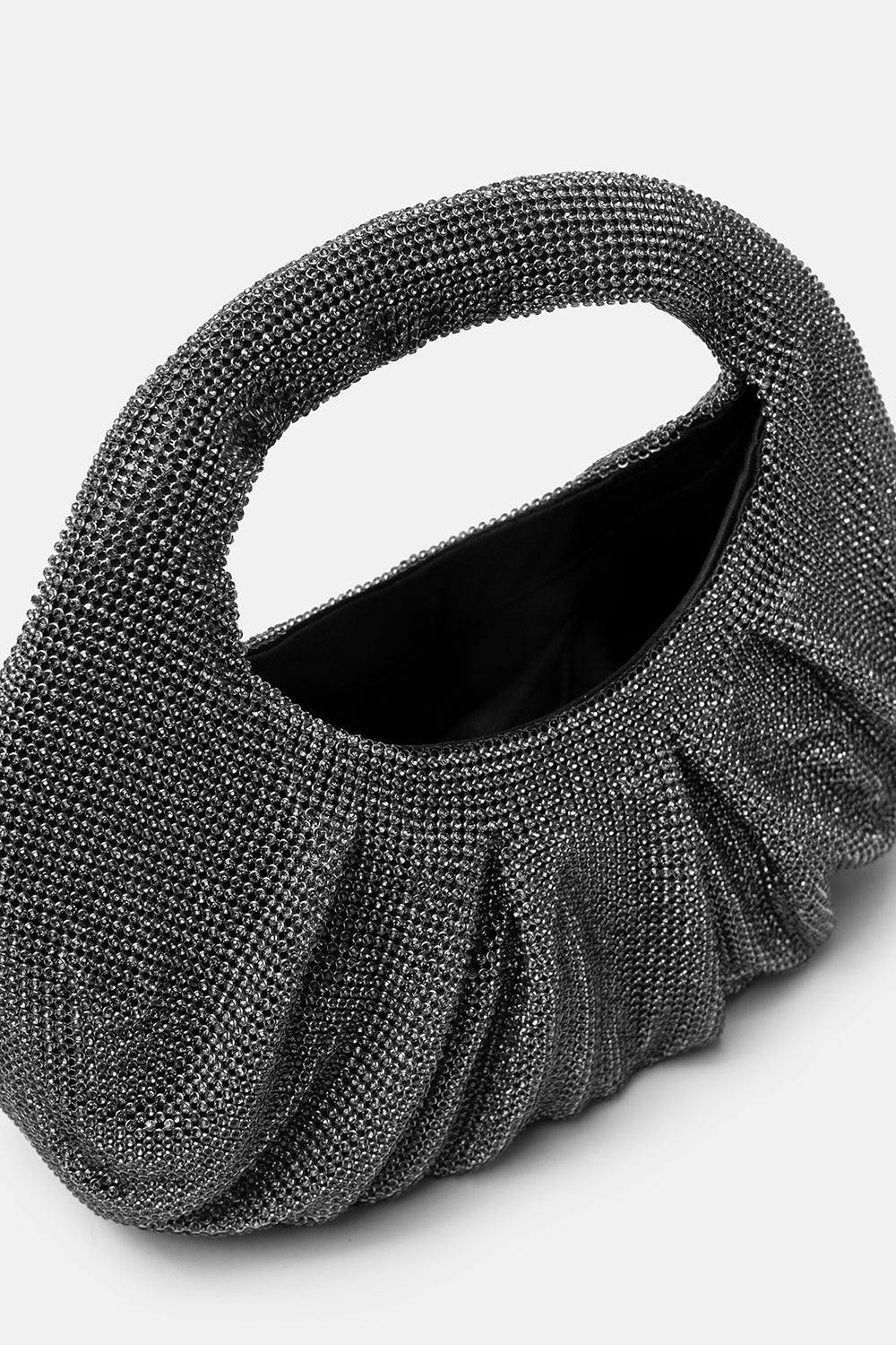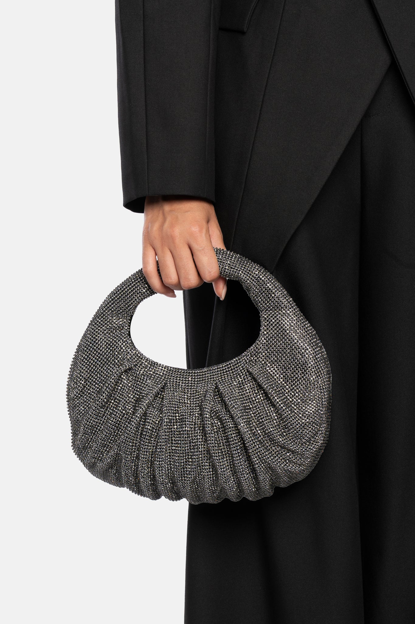 Precious Joan handbag in gray rhinestone mesh, zipper closure.