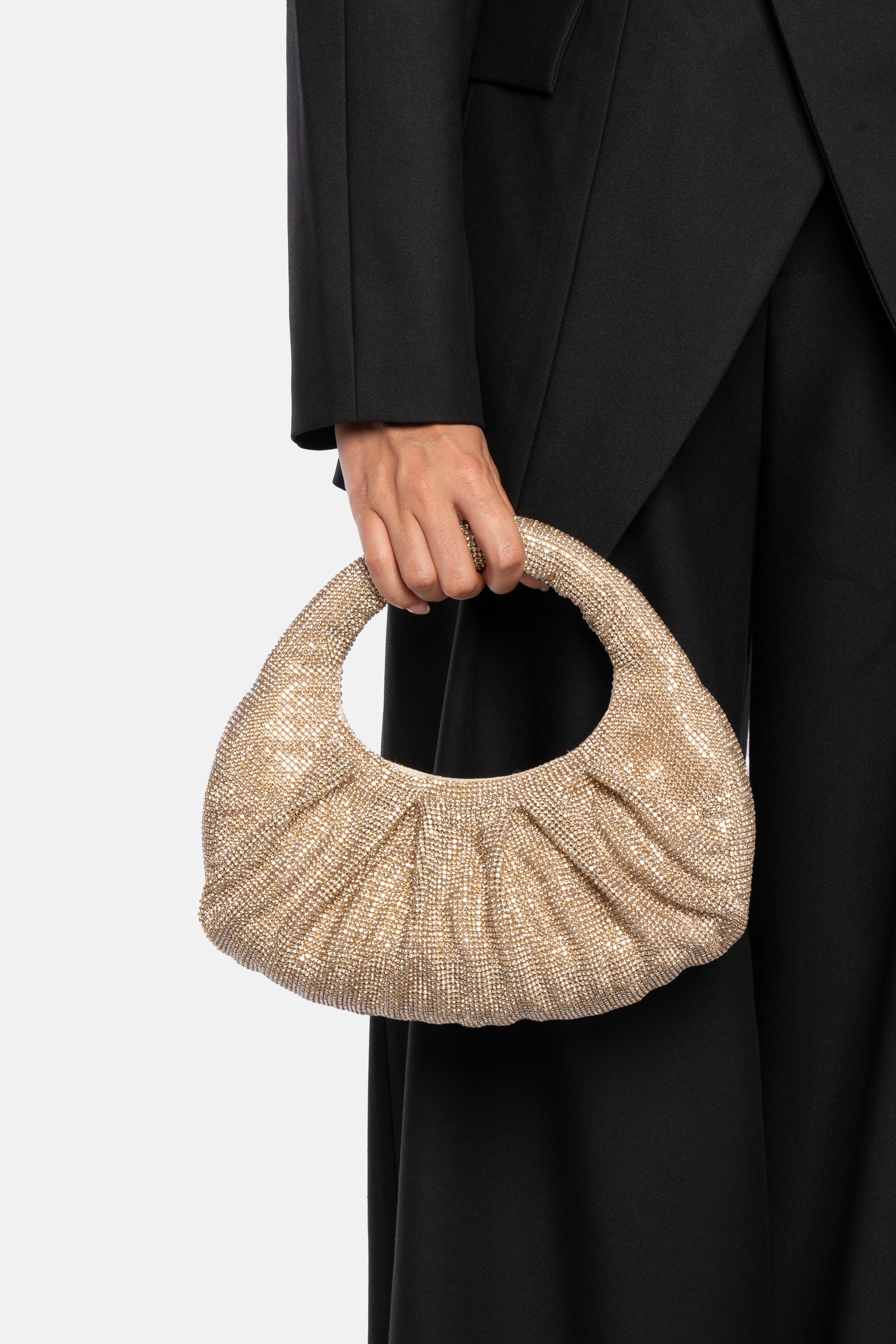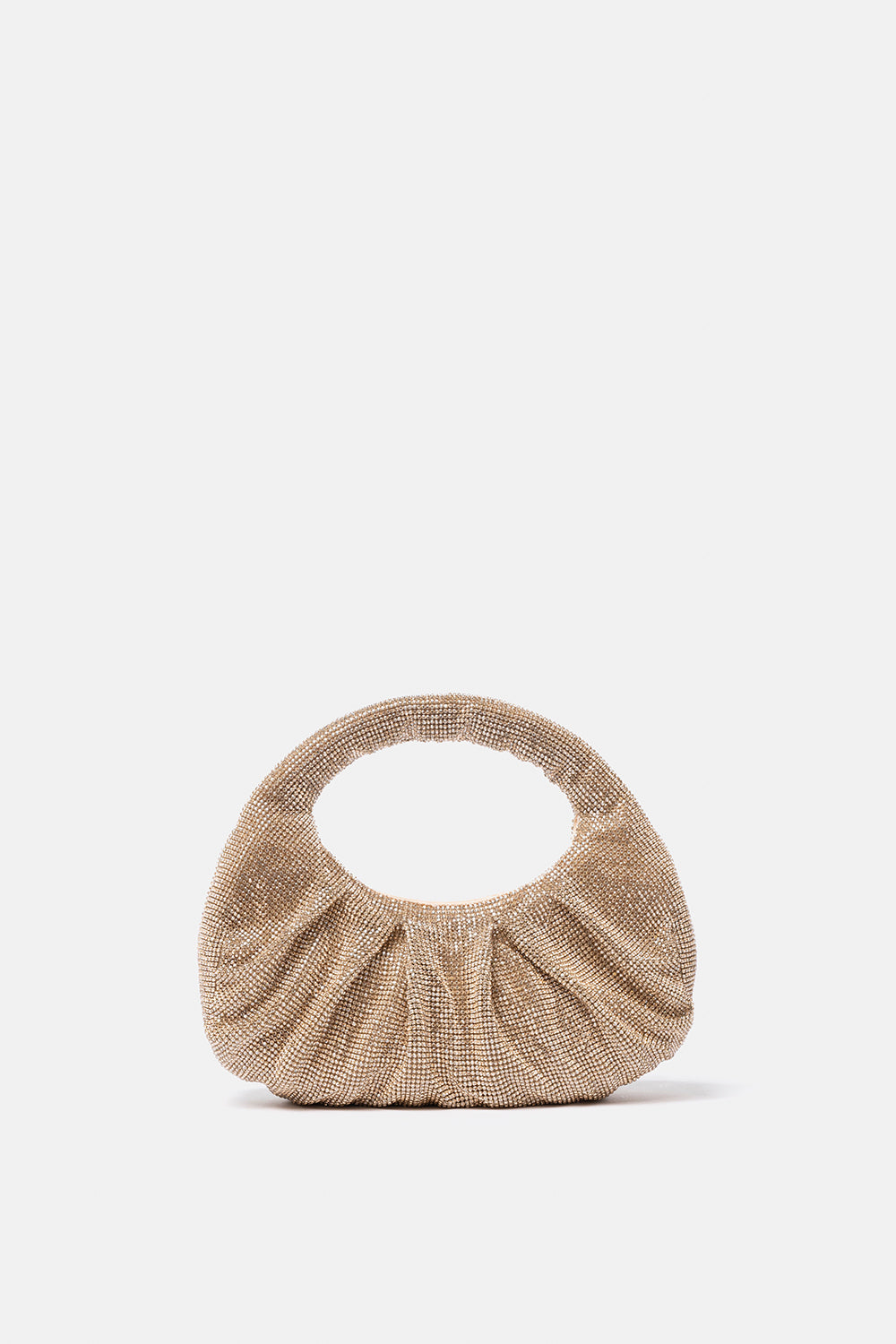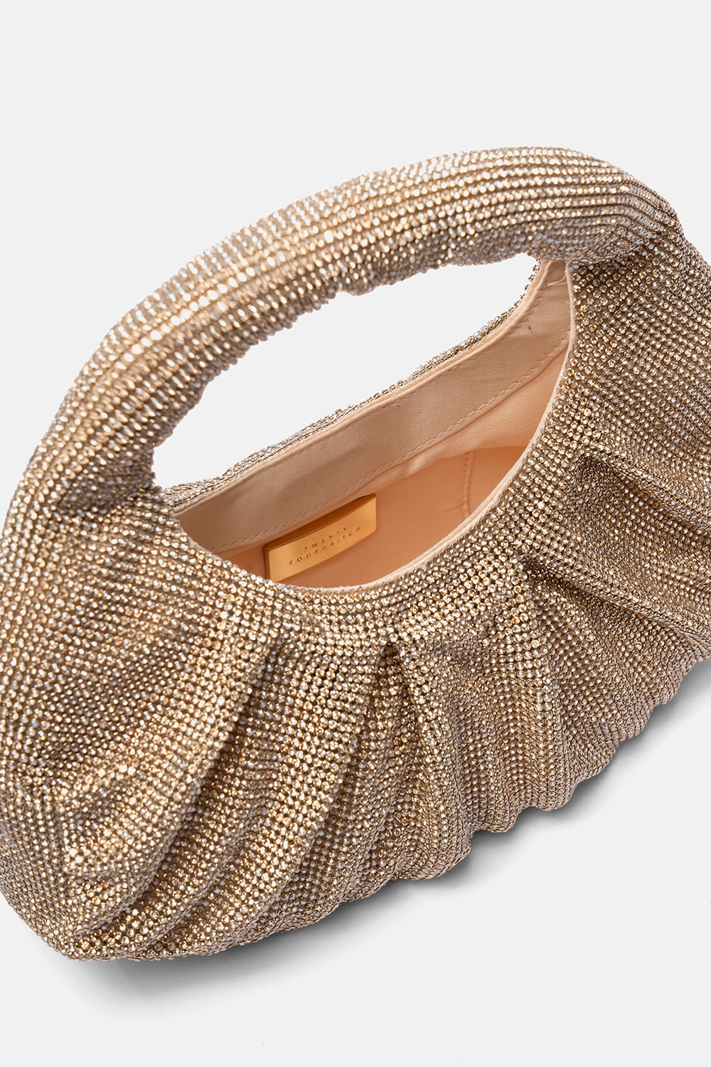 Precious Joan handbag in gold rhinestone mesh, zipper closure.