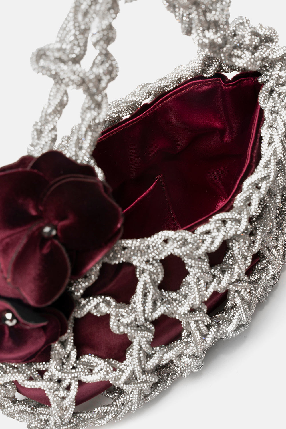 Precious Alkab handbag with silver crystal-studded knots with two plum velvet flowers + internal velvet pouch.