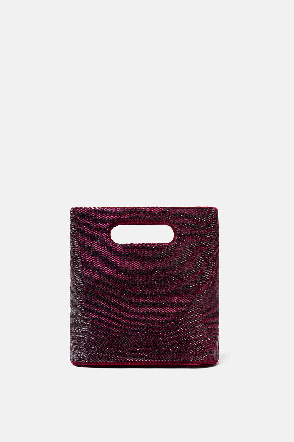 Precious plum velvet-based bag, entirely covered with mini rhinestones. Removable velvet shoulder strap. Hidden magnetic closure.