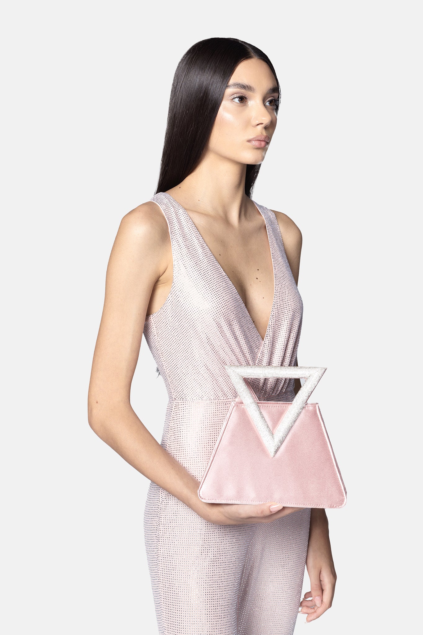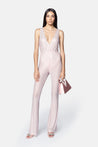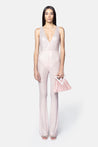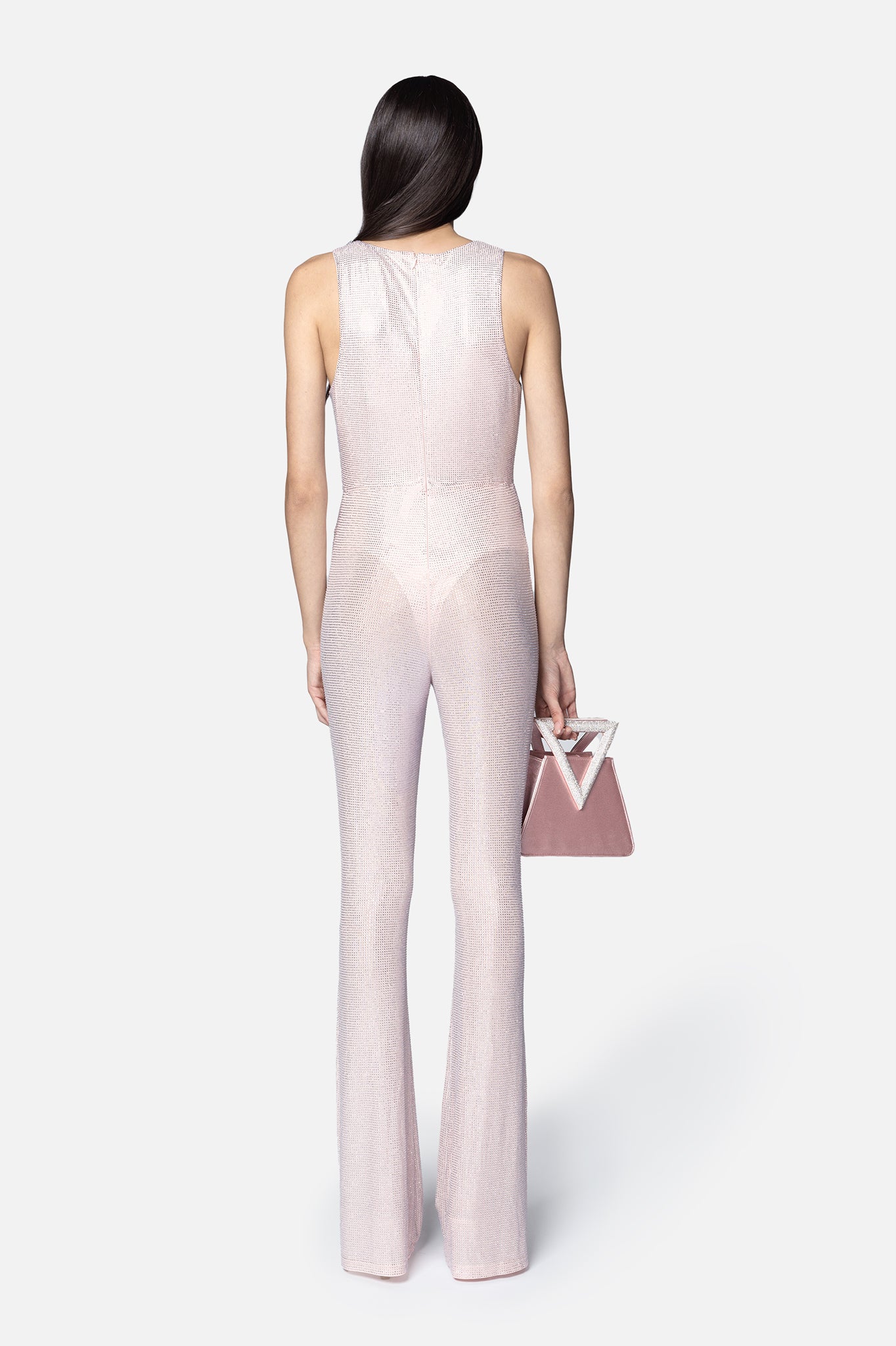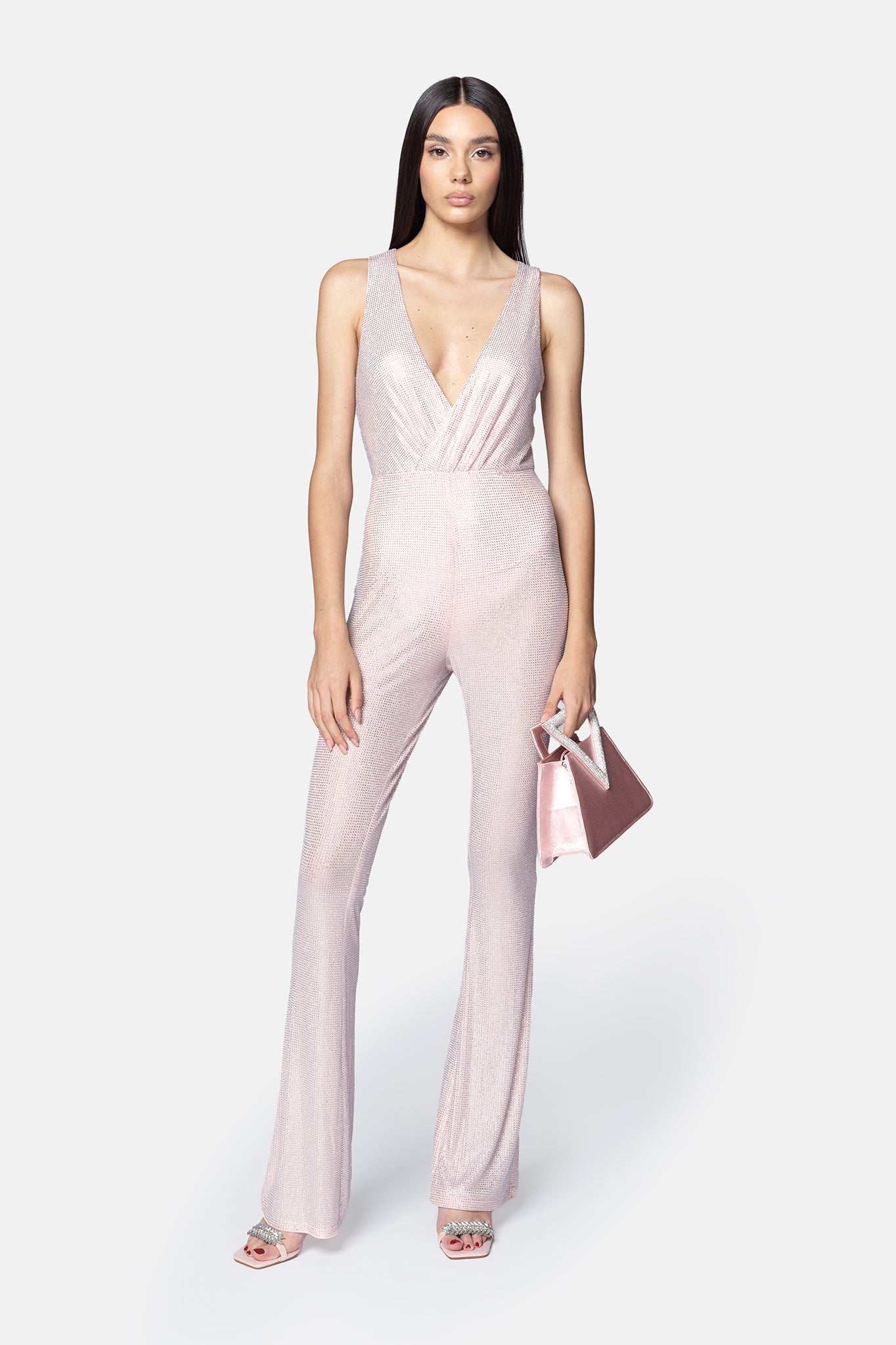 Apollo pink jumpsuit in tulle and elastic fabric covered with rhinestones, tight-fitting line. Pants with wide hem and deep V-neckline at the front.
