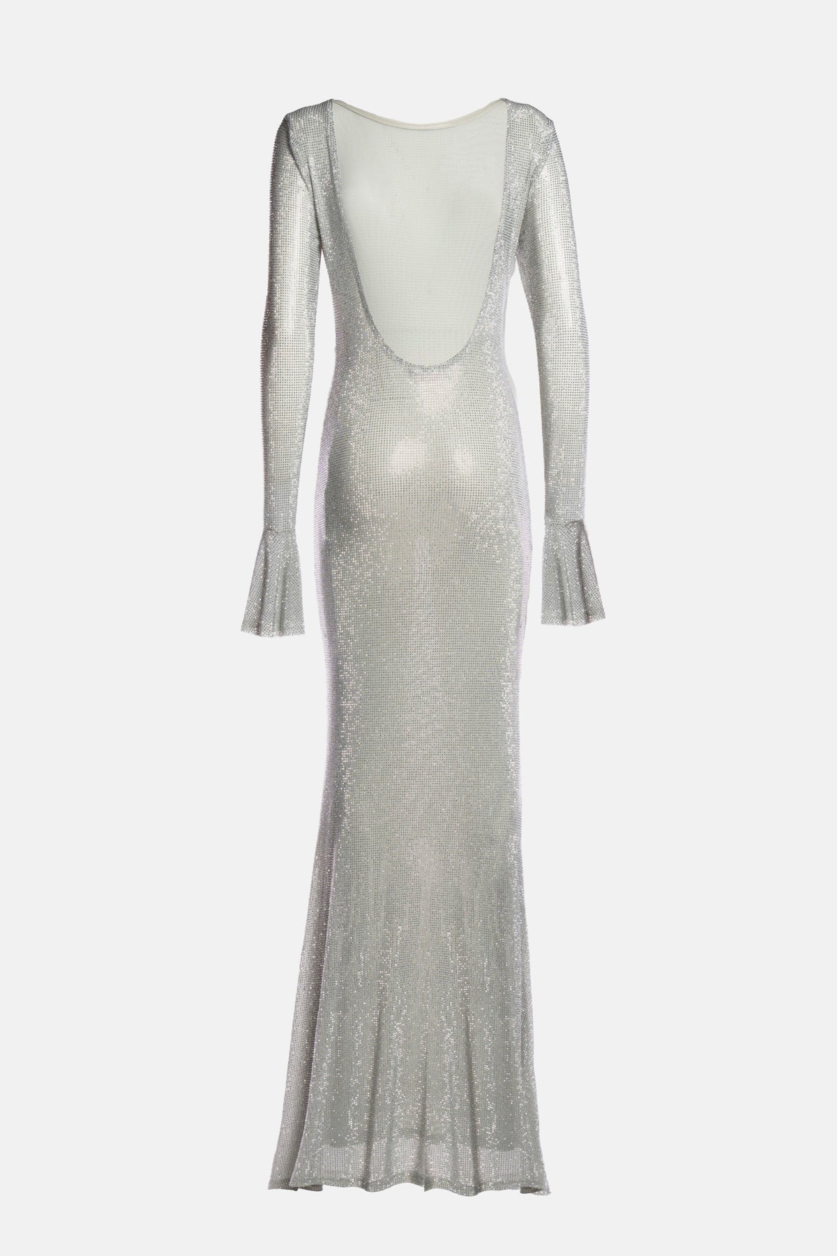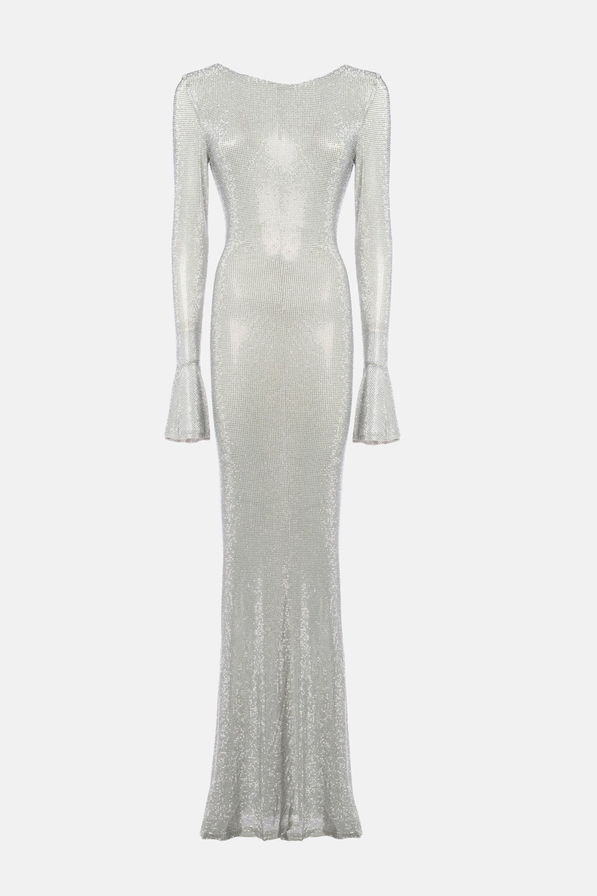 Vestido Algedi largo plateado, línea sirena en tela de tul completamente cubierta de strass, amplio escote en la espalda y manga larga acampanada.
