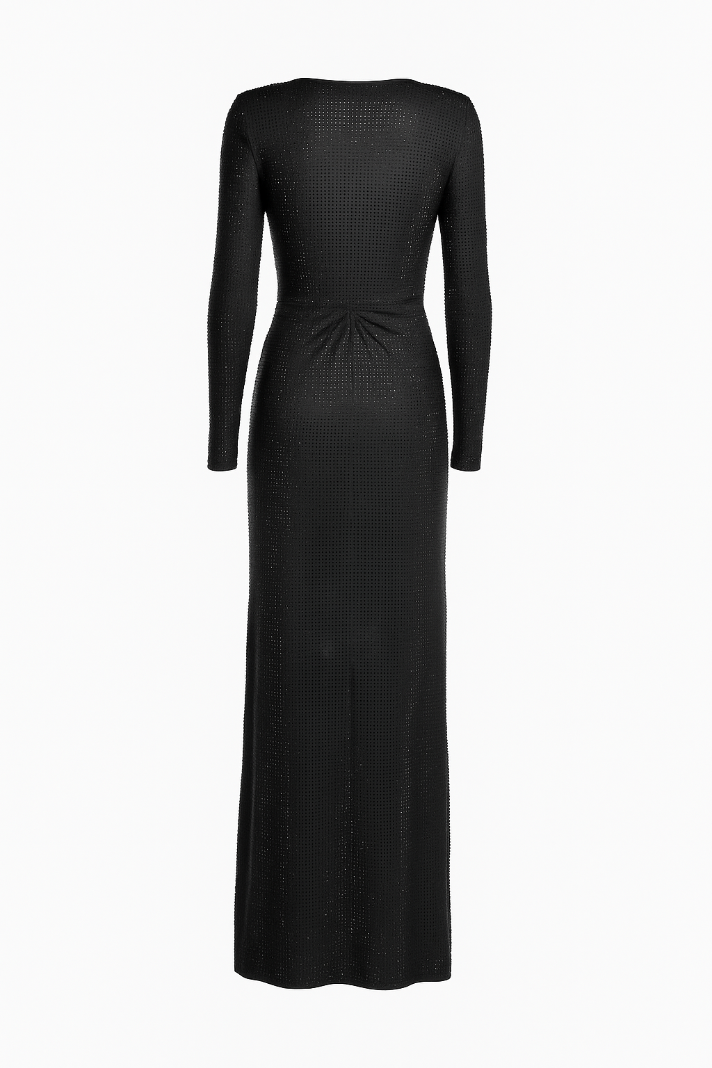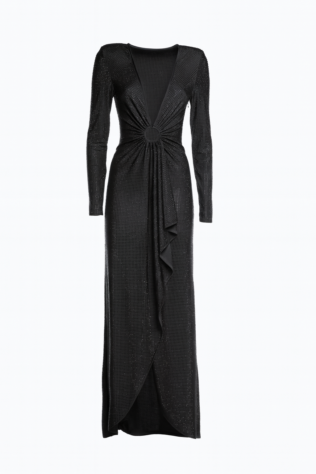 Abito lungo Ipek nero in tessuto elastico con applicazioni di strass, scollo a “V” profondo con effetto arricciato sul davanti e dettaglio ovale centrale. Spalline interne.
