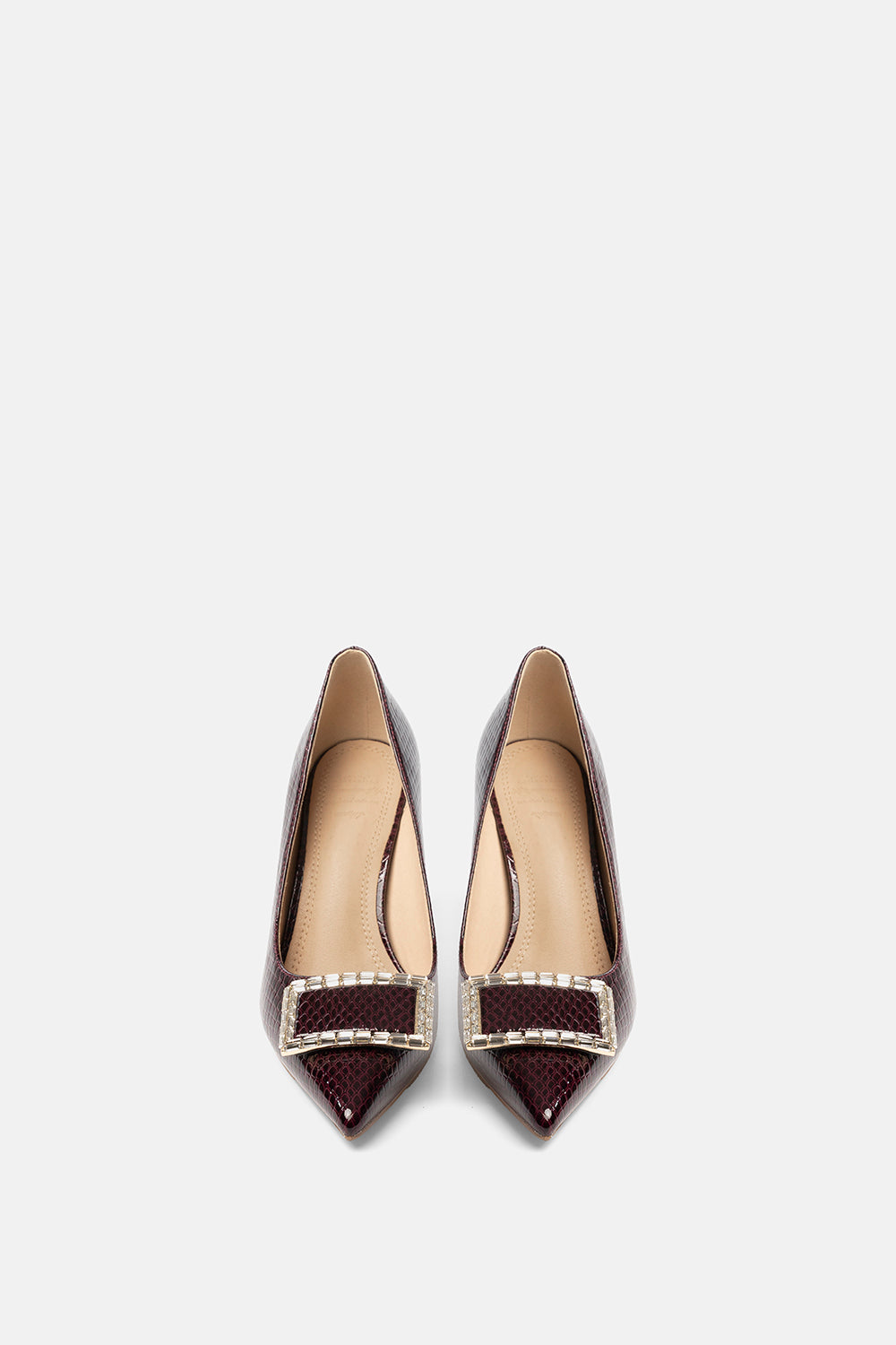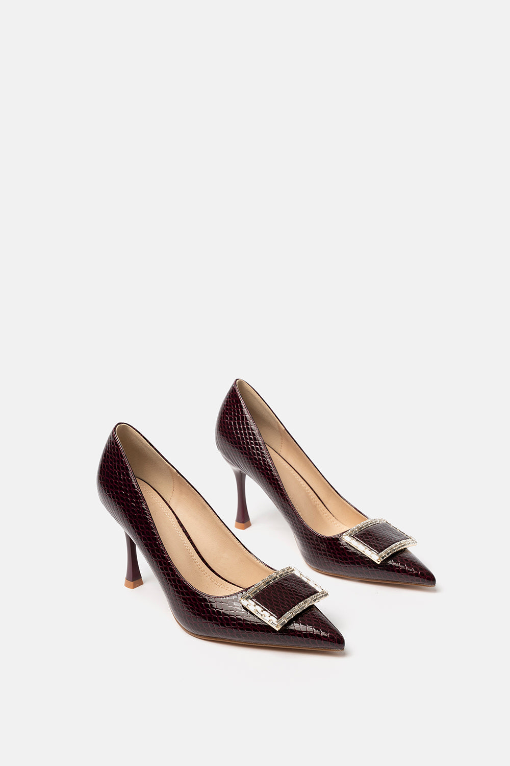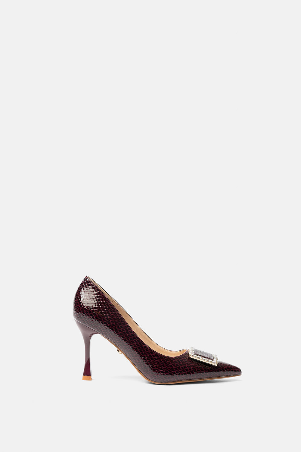 Décolleté Megrez prugna effetto pitonato con fibbia gioiello in punta.