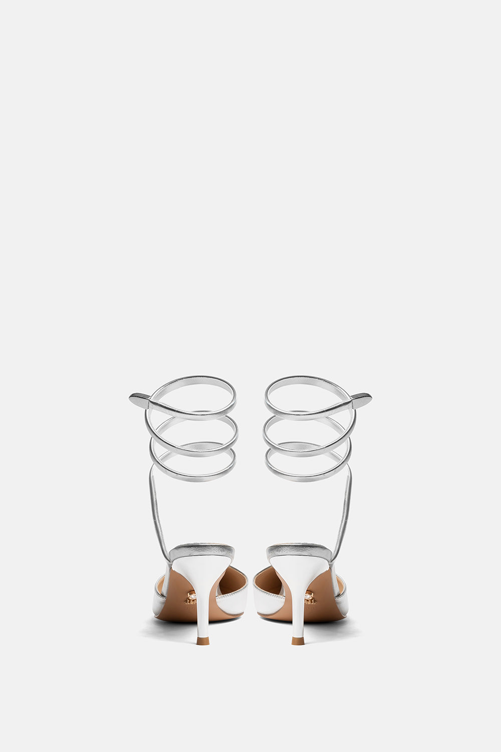 Slingback Arietis argento tempestata da mini strass, con dettaglio serpente alla caviglia.