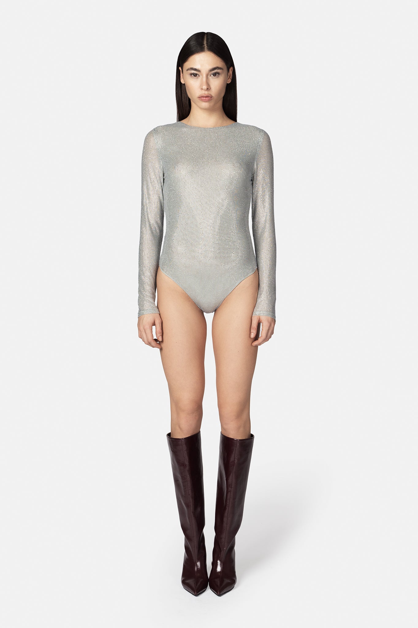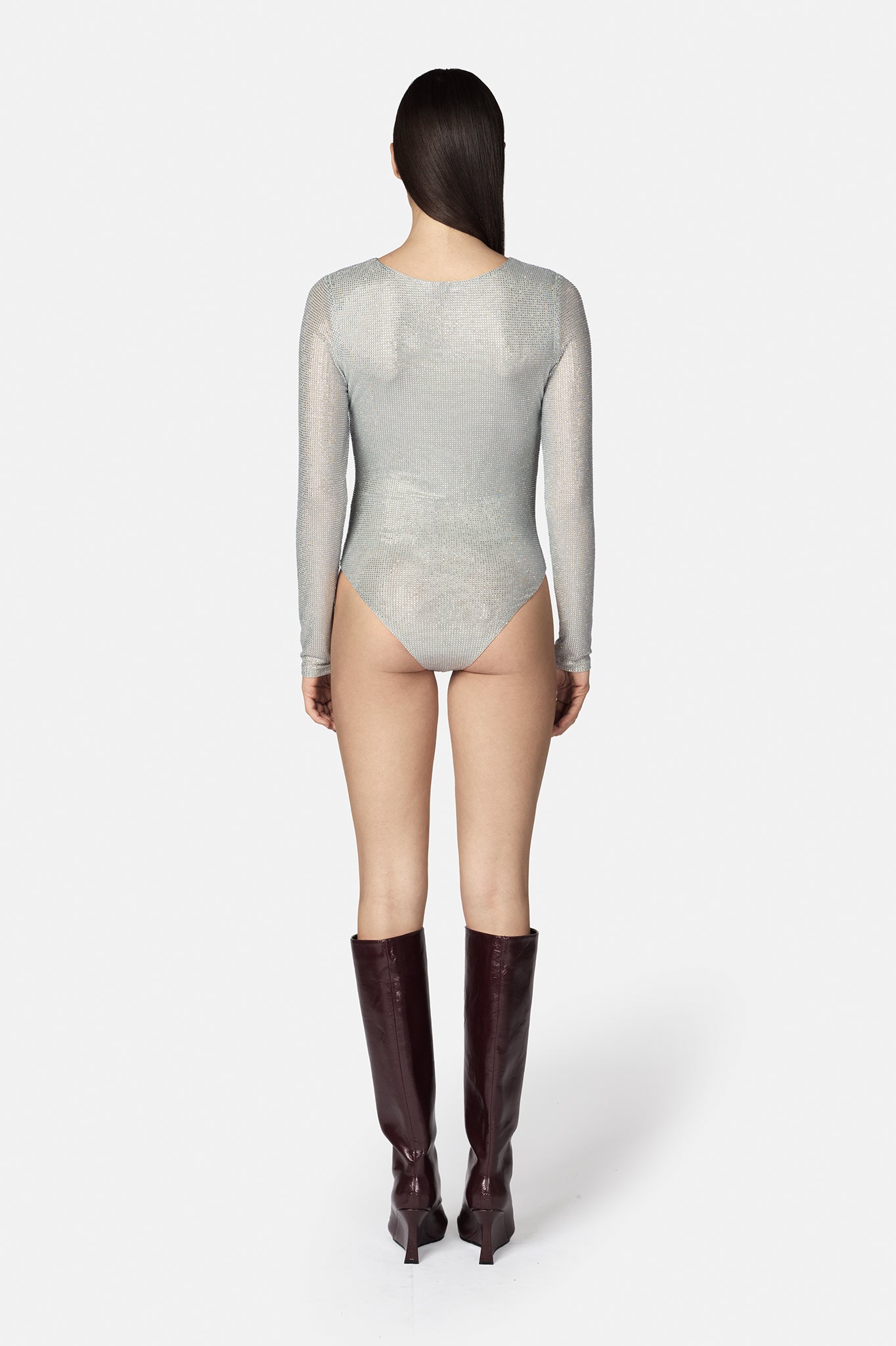 Body Arches plateado ajustado en tejido tul cubierto de strass, escote redondo y abotonadura clásica. Manga de guante.