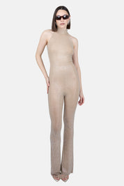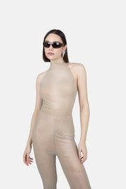 Descripción: Mono de tul elástico, cubierto de strass, línea ajustada.