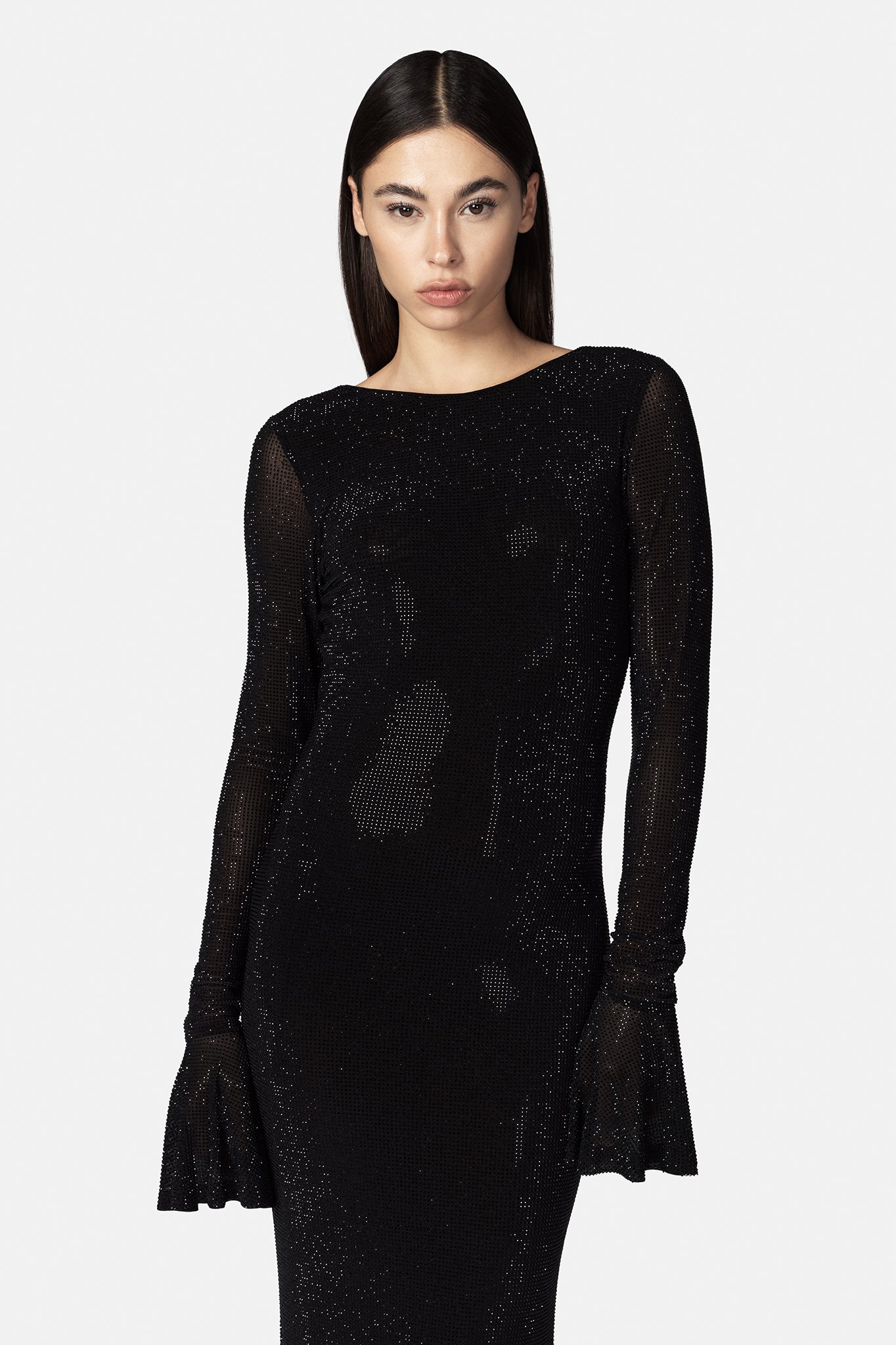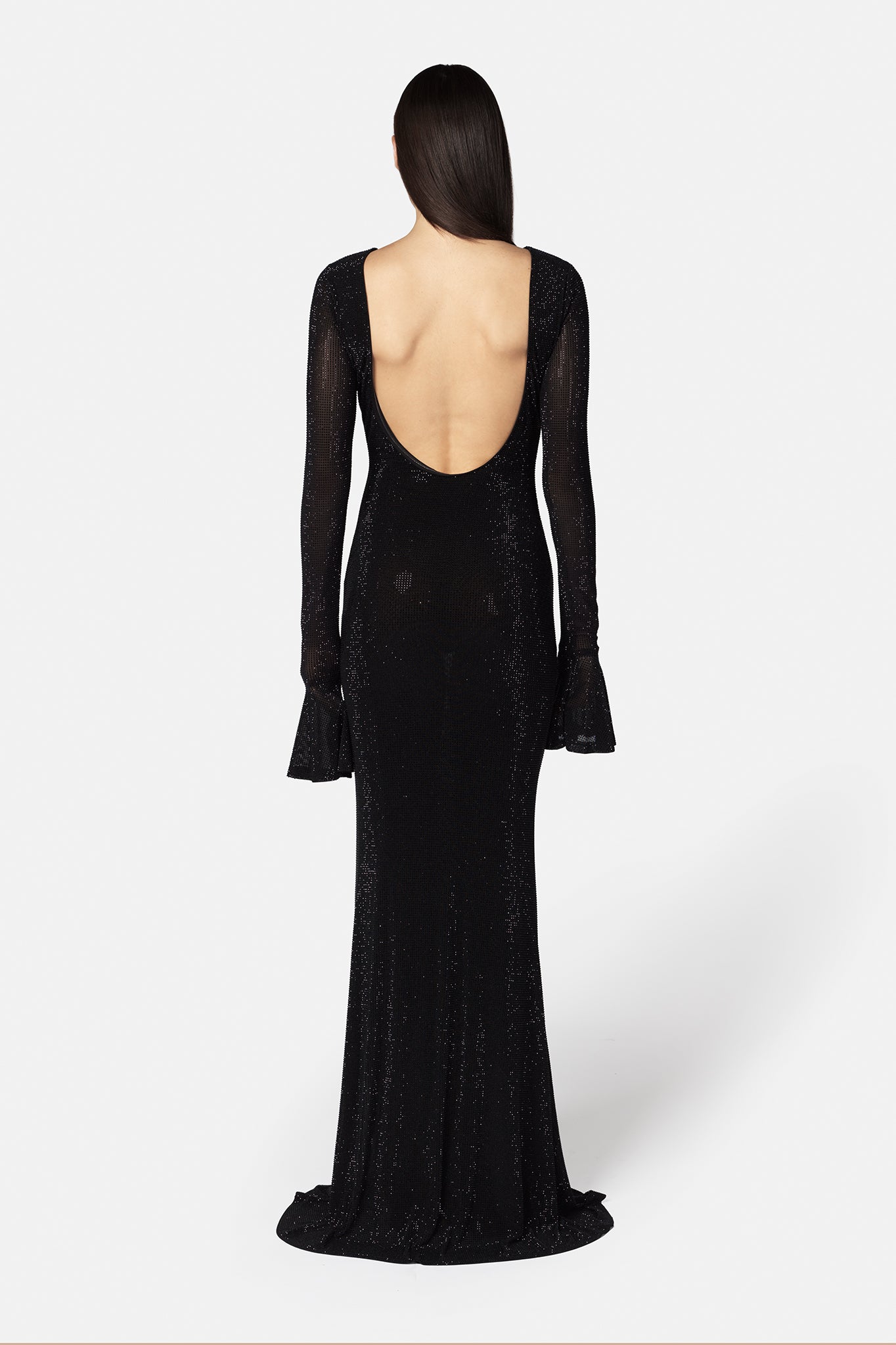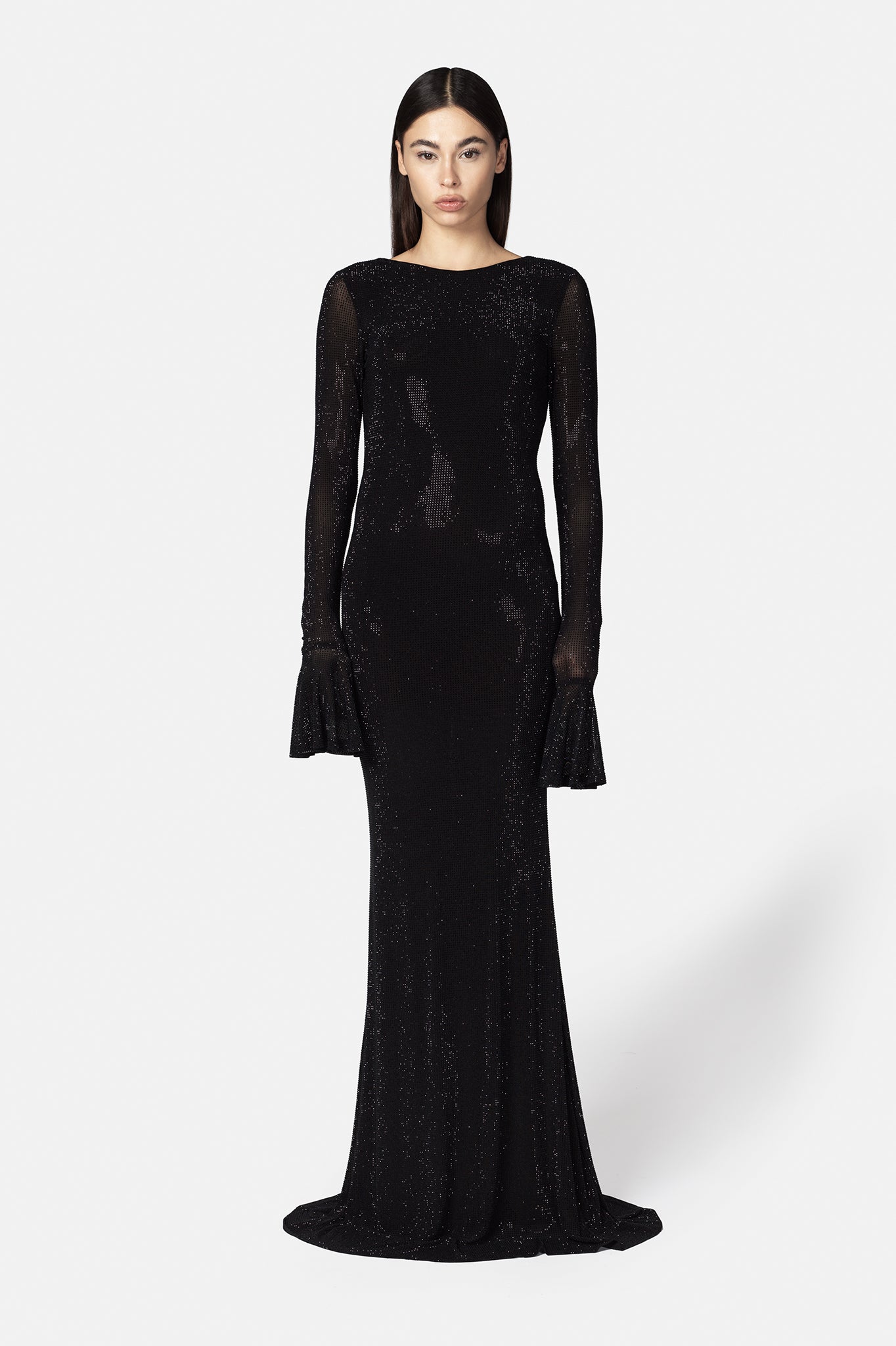 Abito Algedi lungo nero, linea sirena in tessuto tulle interamente ricoperto di strass, ampio scollo sul dietro e manica lunga svasata.