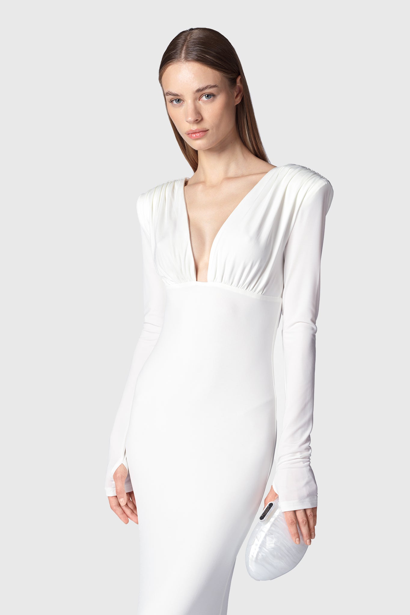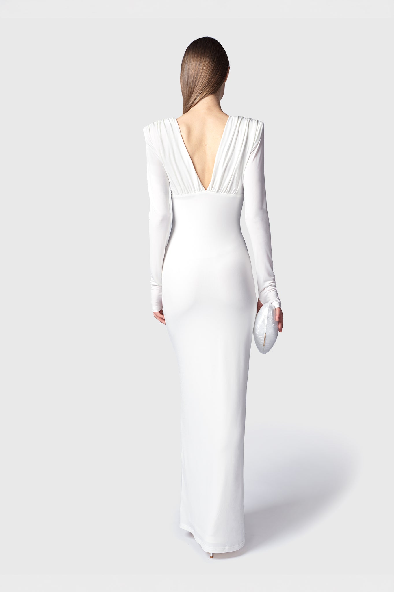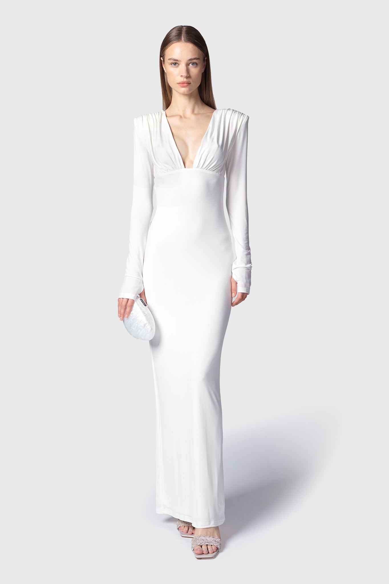 Abito lungo Aysen in tessuto bianco fasciante ed elastico doppiato, corpetto drappeggiato con spallina alta e scollo v fronte e retro, manica a guanto aderente. Vestibilità regolare.