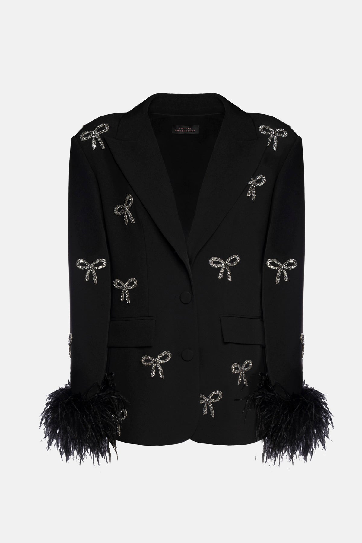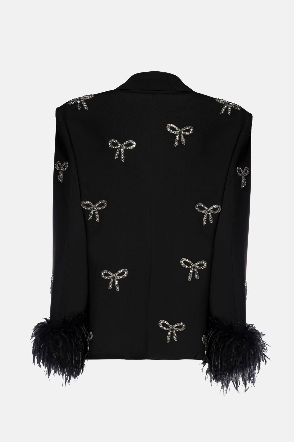 Giacca Deste monopetto in tessuto tecnico nero, fodera in raso con applicazioni fiocchi strass e piuma al bordo manica removibile.
